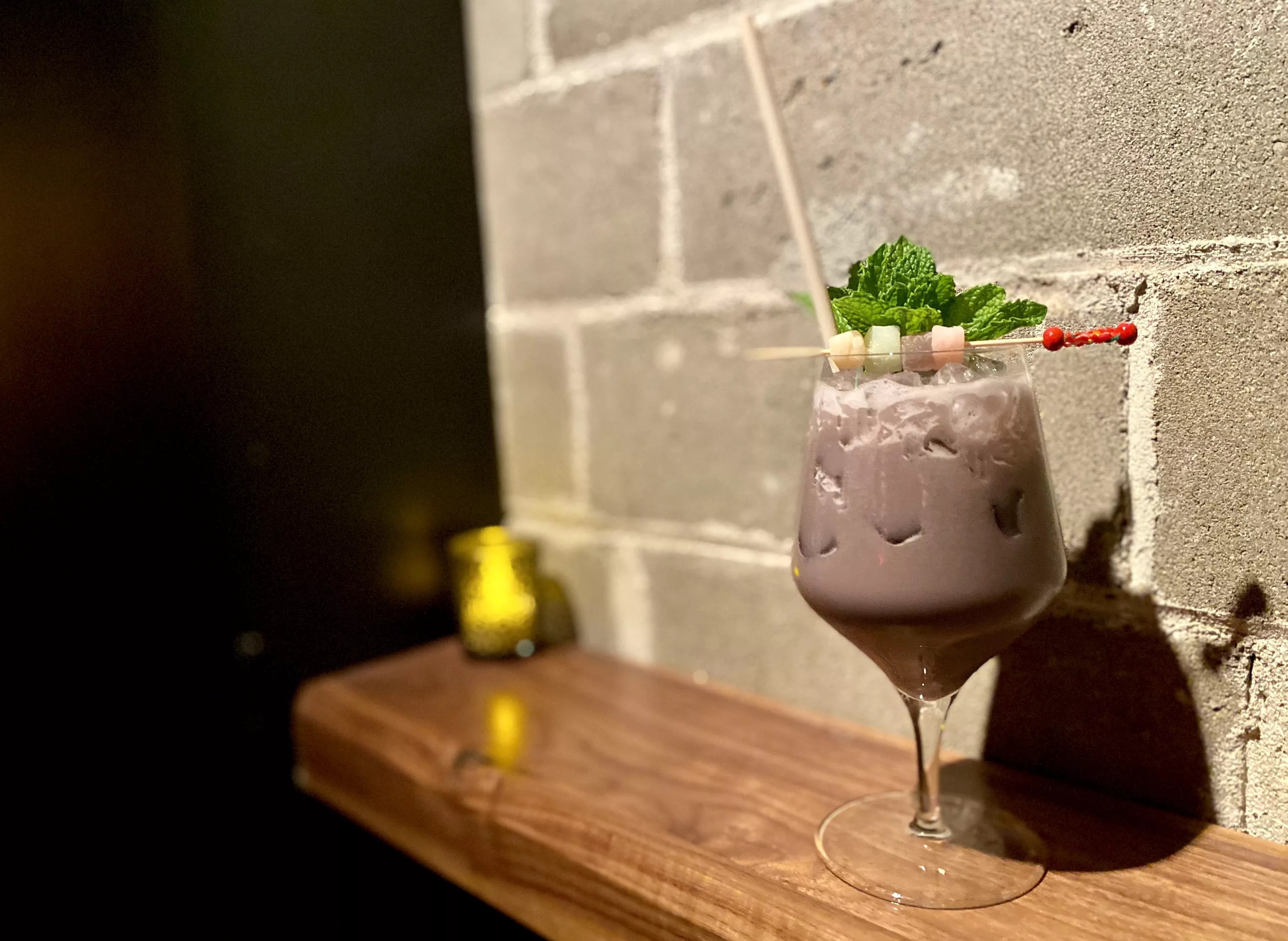 Order the Manila Vice, a bright purple drink made of Filipino and Jamaican rums, ube, a purple yam that gives the cocktail its color, coconut, calamansi citrus, orange, and pineapple. The sweet concoction will come to you in a wine glass topped with pastel mochi candies.