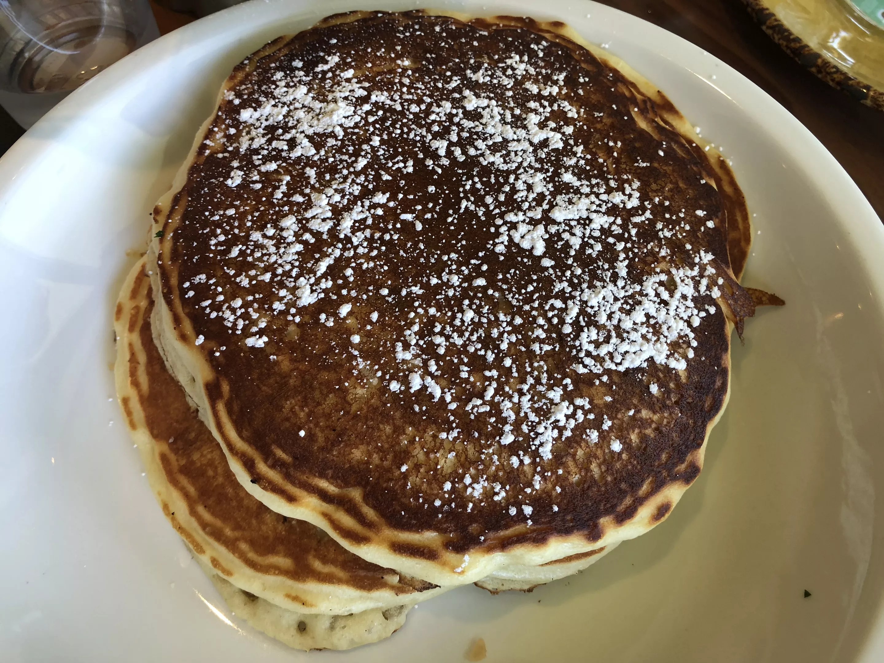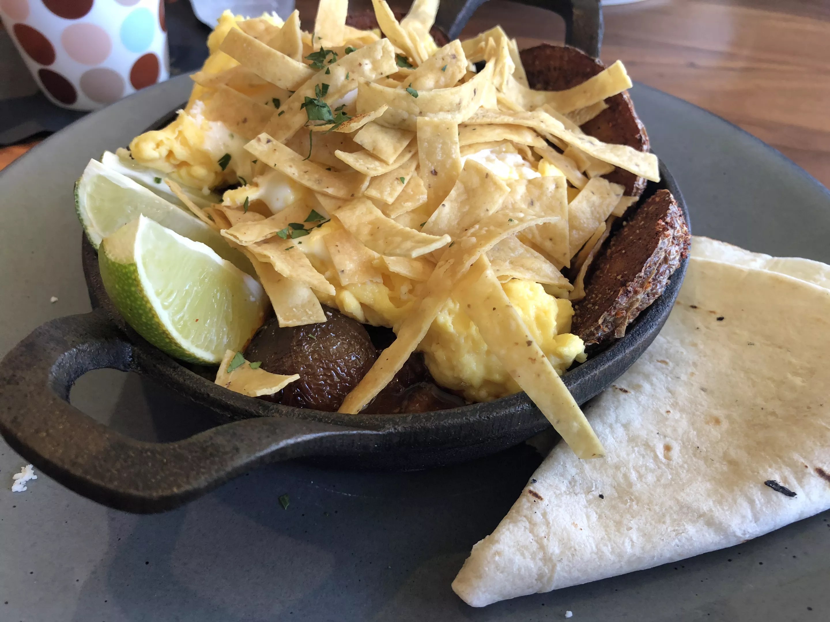 Savory food options include a breakfast BLT, breakfast burrito, smoked salmon plate, and an intriguing number called “planks + eggs.” The planks are potatoes. Cooked to warmth and outer crispness, they come with eggs, cotija, tortilla strips, and “red chile.” The dish has potential. But the dish ultimately fails to deliver on the promise of red chile. When you order red chile, you want heat. This dish was about as spicy as a plum, with a depth that tasted more like beef drippings than the Southwestern stew.