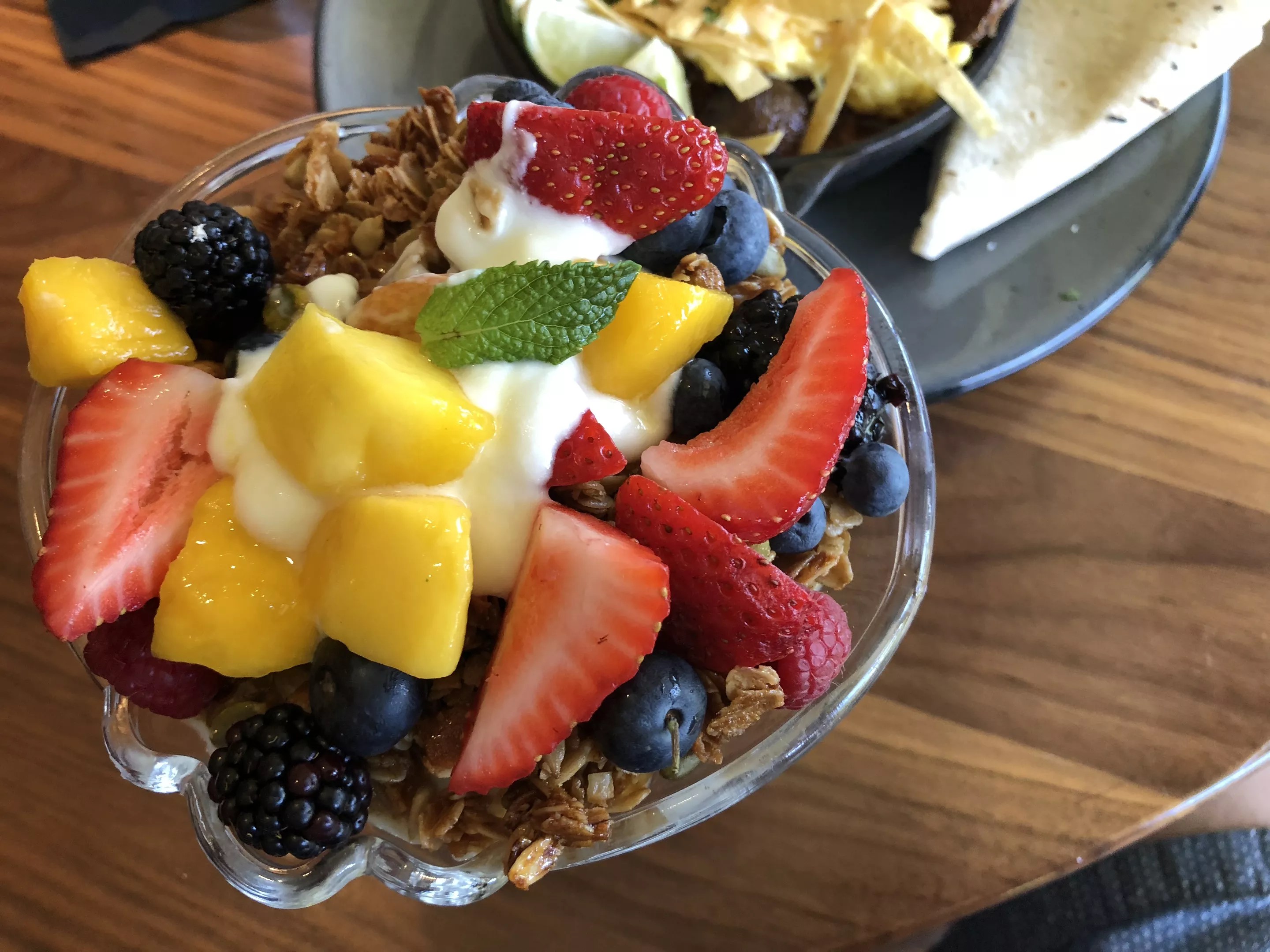 Pancakes are a safe, solid bet. Sea salt butter on them is a nice touch. Other sweet options include red velvet waffles and brioche French toast with Polynesian flavors. A breakfast parfait comes generously studded with various fruit. Be sure to stir the fruit puree hidden at the bottom of the glass into the rest.