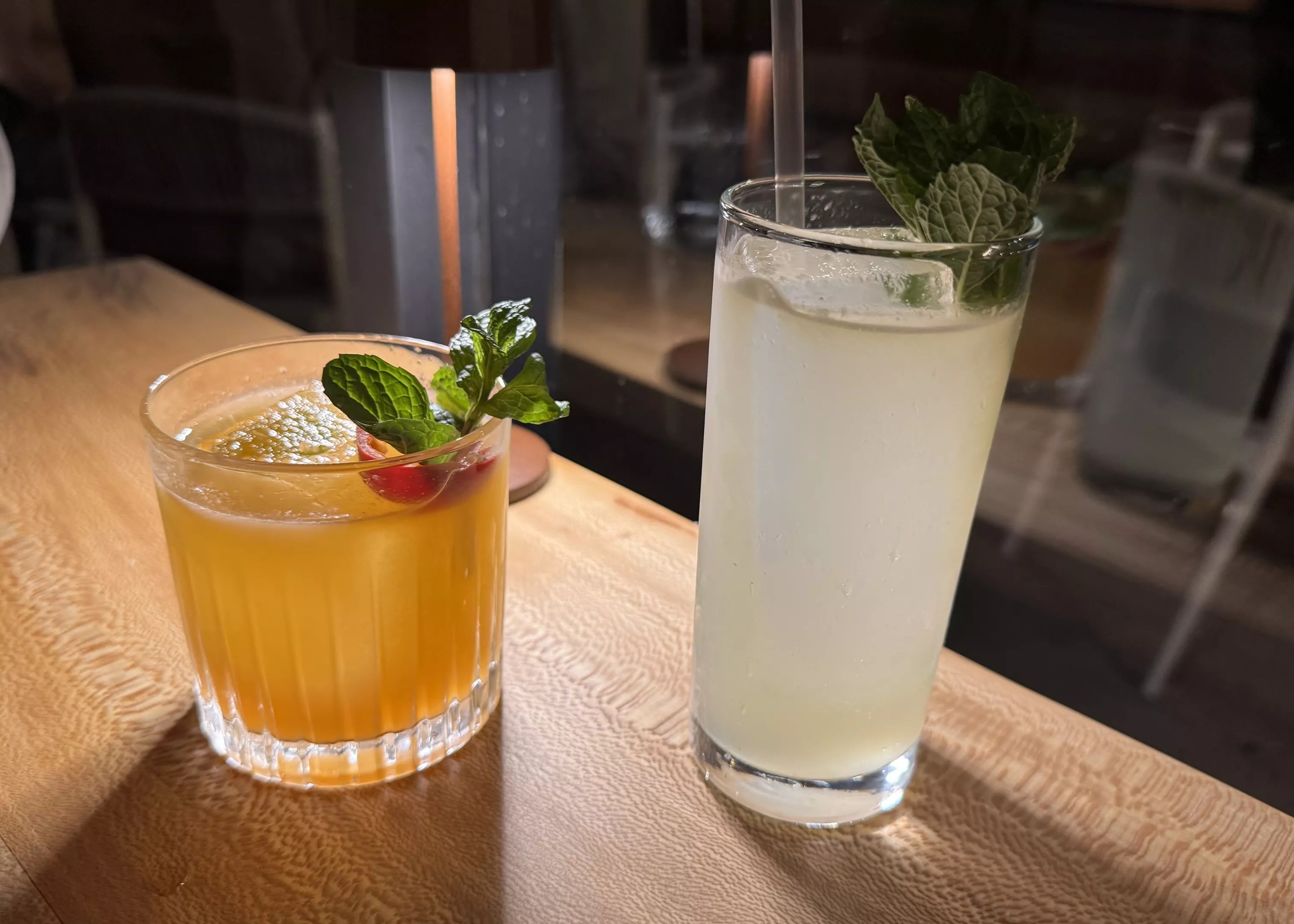 Inside, the restaurant and bar have an intimate, industrial feel. Grey checkered wallpaper envelopes the moodily lit room. On a recent visit, we took a seat at one of the dining area’s warm wood tables in comfy leather and brass chairs. A small tabletop lamp casts a warm glow. It feels like the setting for a cozy date night, but the vibe is casual and upbeat, with the buzz of electronic music and bartenders shaking drinks. Behind them, a row of eye-catching emerald green arched shelves hold bottles and glassware.