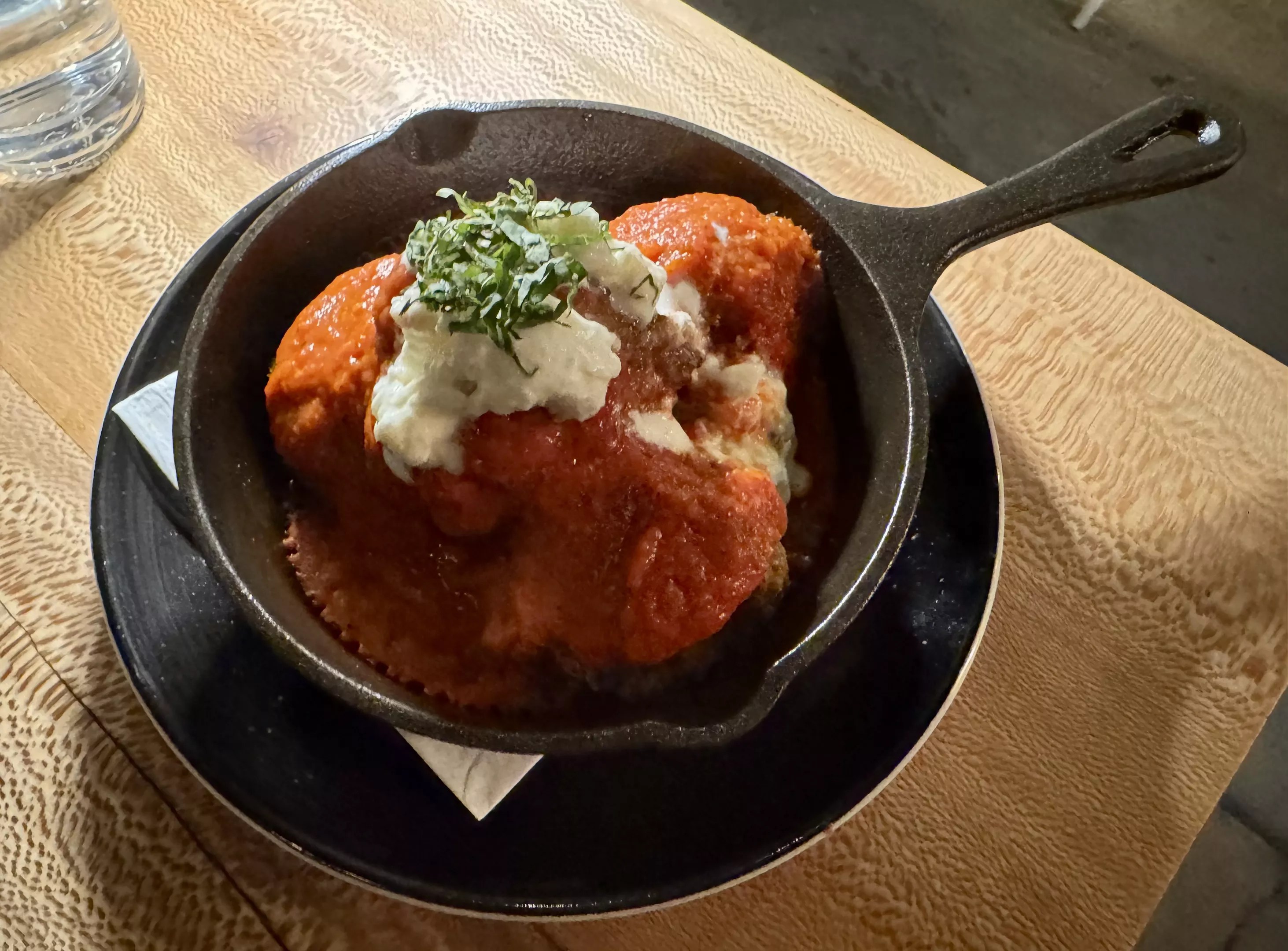 Next up: duck meatballs in arrabbiata sauce. The meatballs pack a punch of flavor in their tiny cast iron pan thanks to a velvety, bold sauce. Duck isn’t often showcased as meatballs, but in these, a tender decadence and gamey poultry flavor make a case for change. Tendrils of the dolloped stracciatella cheese playfully pull and offer a respite from the sauce’s spice.