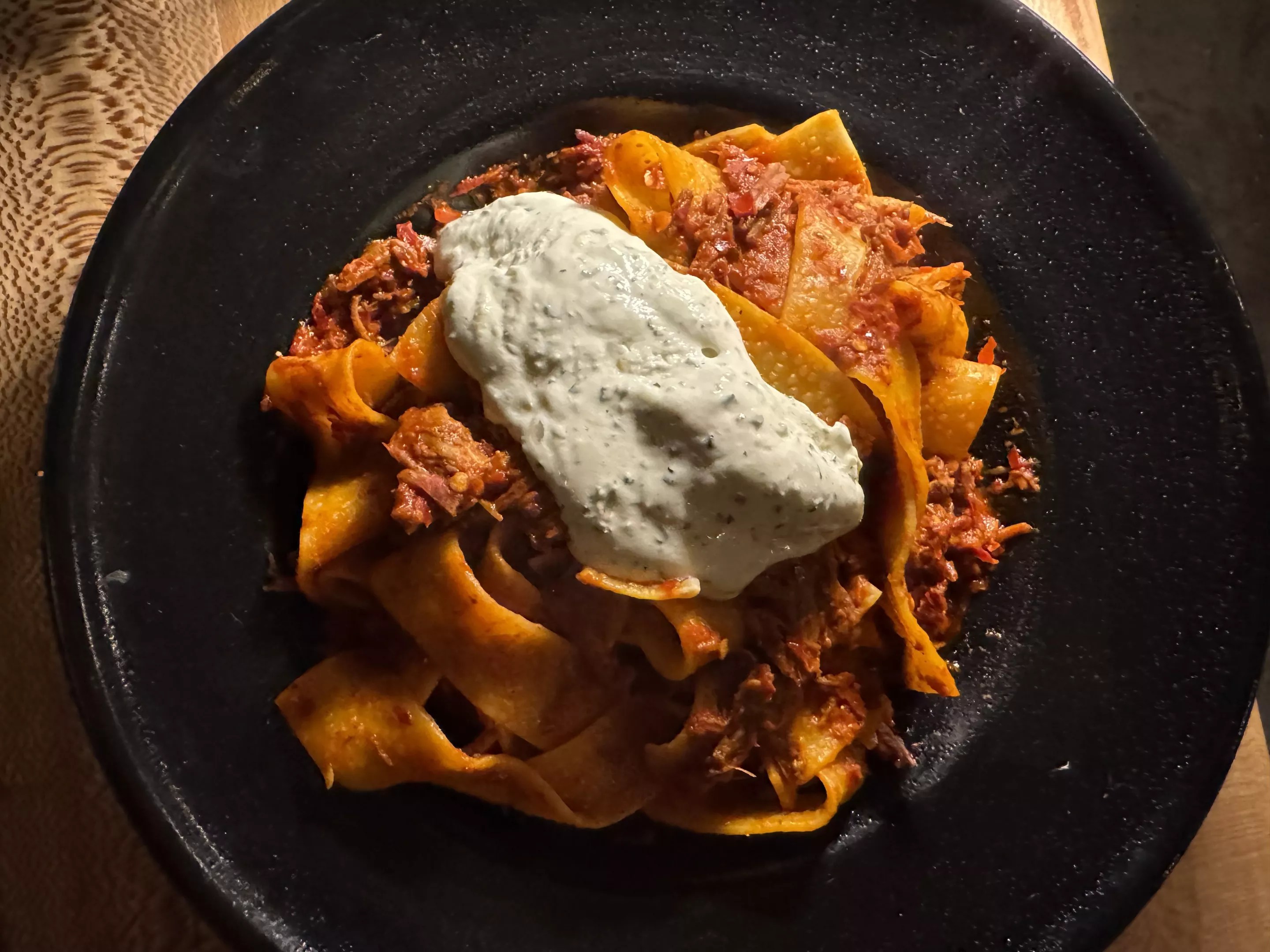Al dente pappardelle is tossed with harissa and lamb shoulder and finished with a dollop of yogurt flecked with chopped mint. That yogurt cuts through the richness of the meat, but we also expected it would calm the heat of harissa, which can range from smoky warmth to fiery, peppery heat. In this dish, the spice was mild.