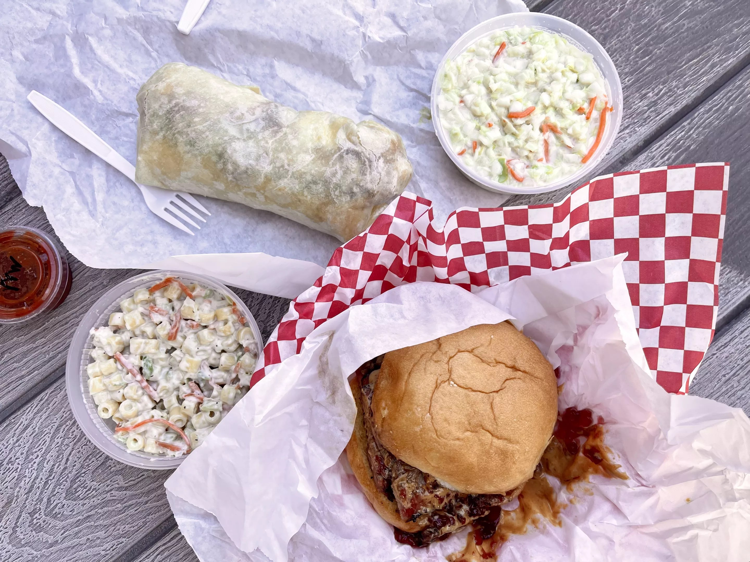 As you sit at a picnic table, sweet and tangy barbecue sandwich in hand, and cooling misters rain down among the greenery of the orange trees, you almost forget, just for a second, that it’s hotter than 110 degrees in the desert. The experience transports you to the idea of summertime, a season for sitting outside in the sunshine enjoying barbecue. And for however long it takes you to demolish a brisket sandwich, this little roadside stand in Mesa makes that dream a reality.
