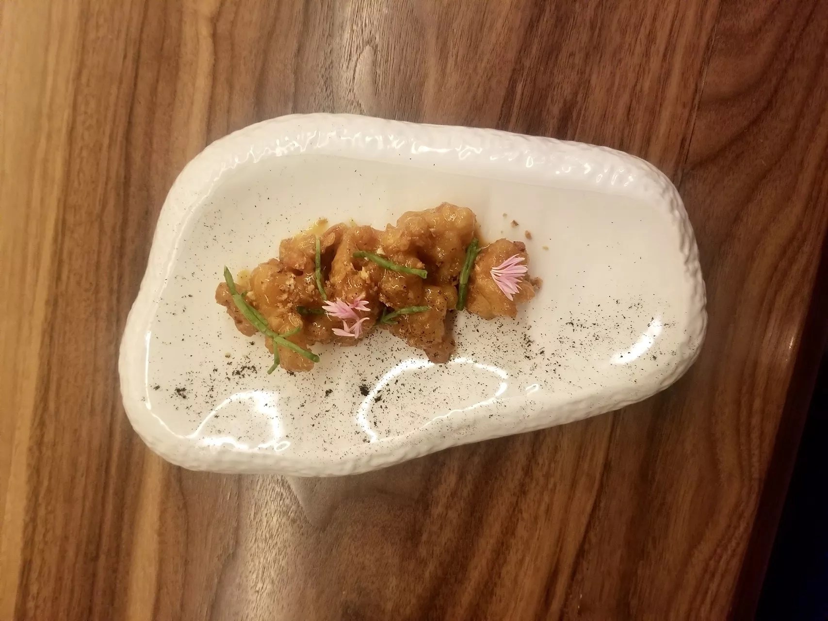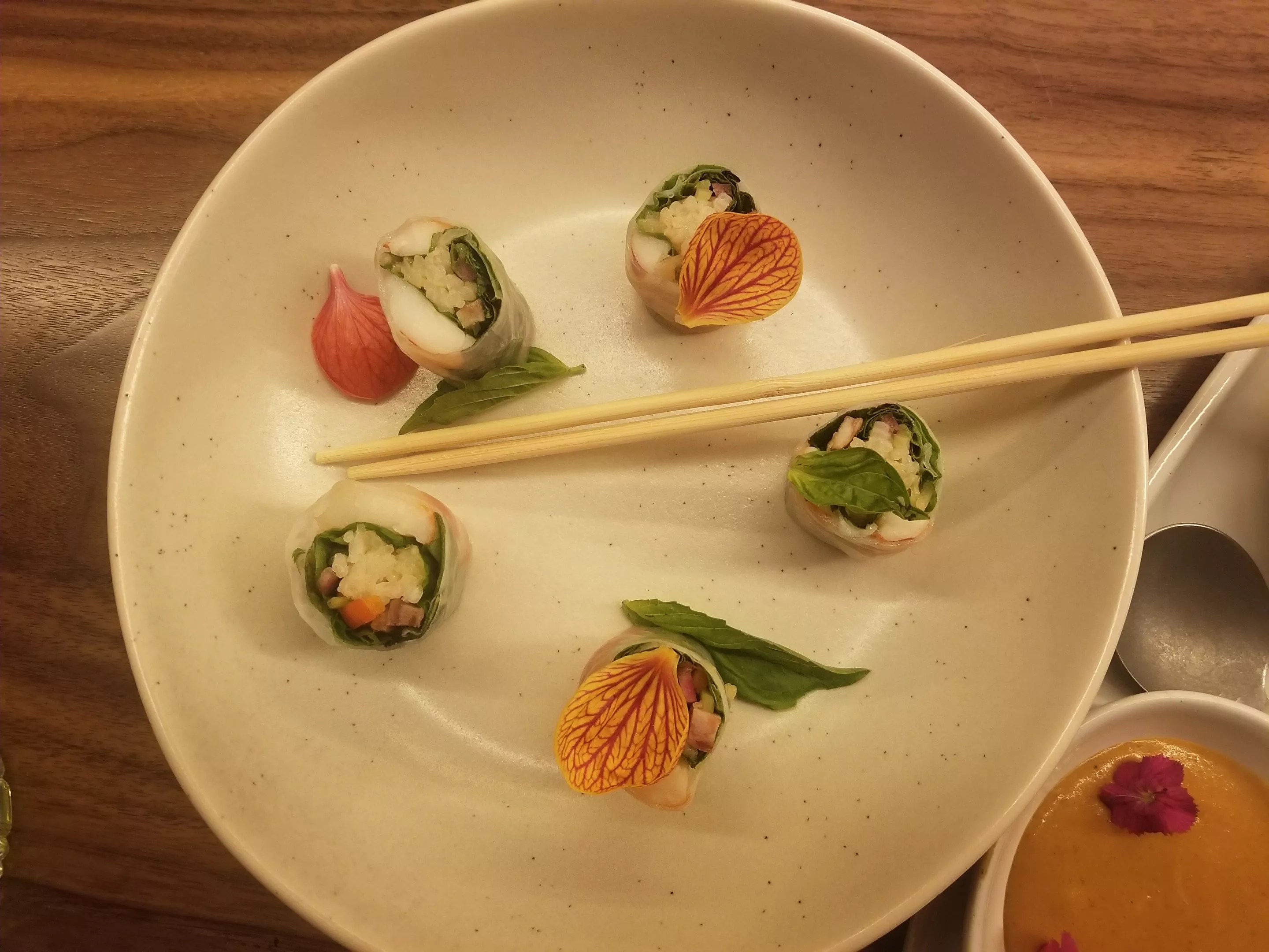 A fork in the road: We were caught between the spring roll and the agnolotti, but the server recommended the former. Another pretty plate presented itself, with even prettier food, neatly rolled into five little segments filled with tiger prawns, Chinese sausage, lollo rossa (red leaf lettuce), and Carolina gold rice. It was fresh, it was light, and it definitely didn’t belong at Panda Express.