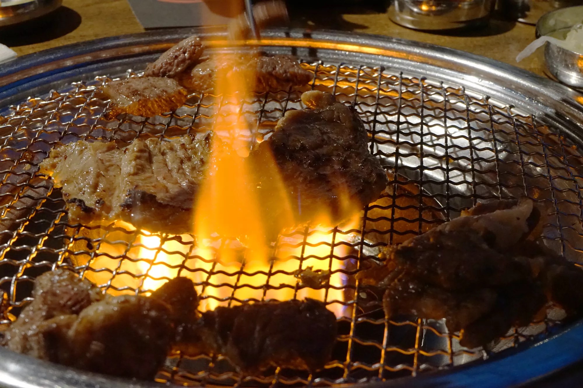 AT KBBQ restaurants, grills are either inside or on top of tables. At most places, the center of the table holds a gas or charcoal chamber, covered with a removable grate and a vent overhead. Guests choose from a selection of various meats – sometimes all-you-can-eat, sometimes from a set menu – and cook them together, eating food hot off the grill. Popular cuts of meat include bulgogi (thinly sliced, marinated beef loin), samgyeopsal (thick strips of bacon-like pork belly), and galbi (marinated short ribs); but most KBBQ restaurants have a wide selection that can feature intestines, neck, tongue, and much more.