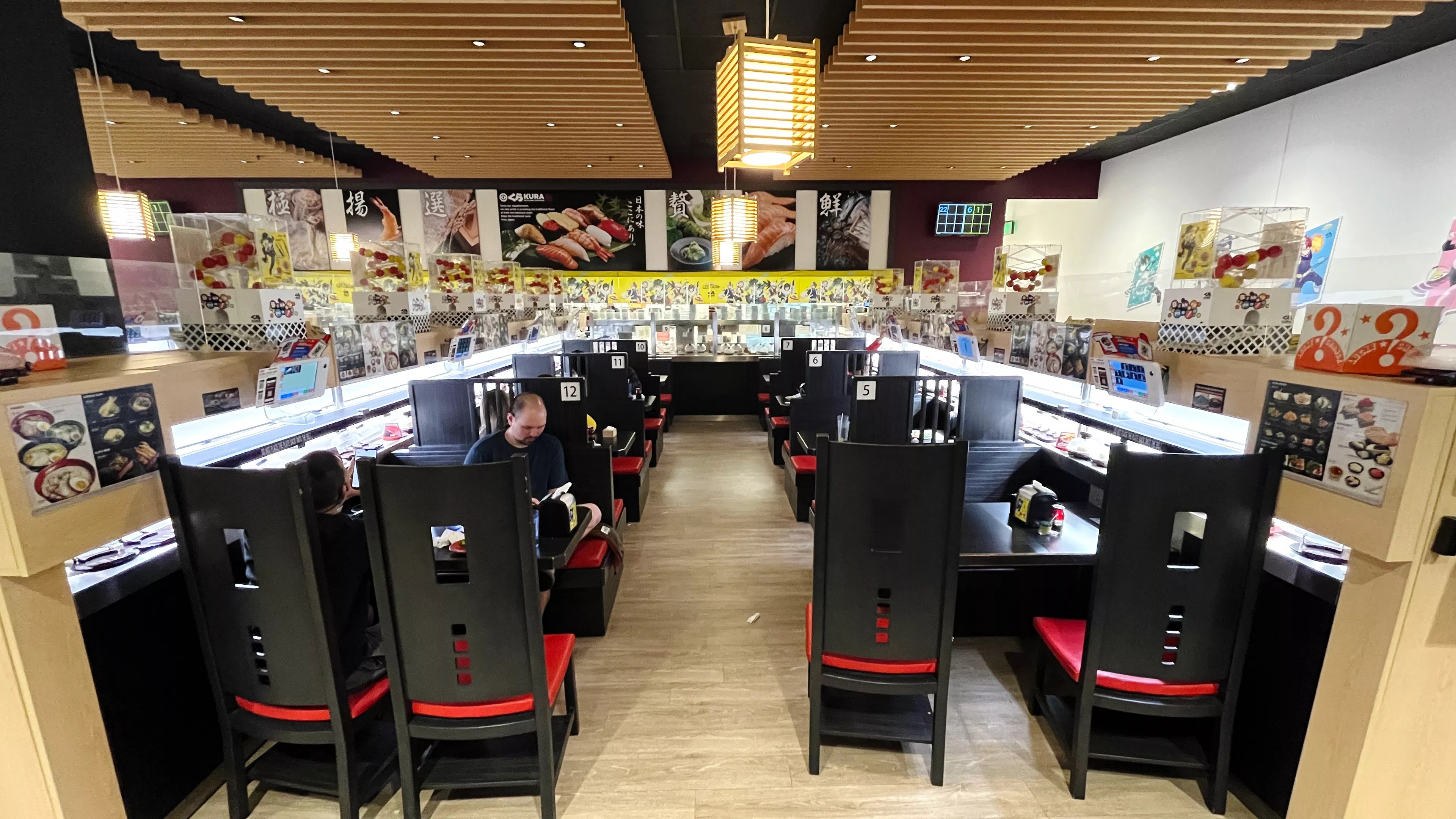 Tables at Kura are arranged to maximize access to the conveyor belt.