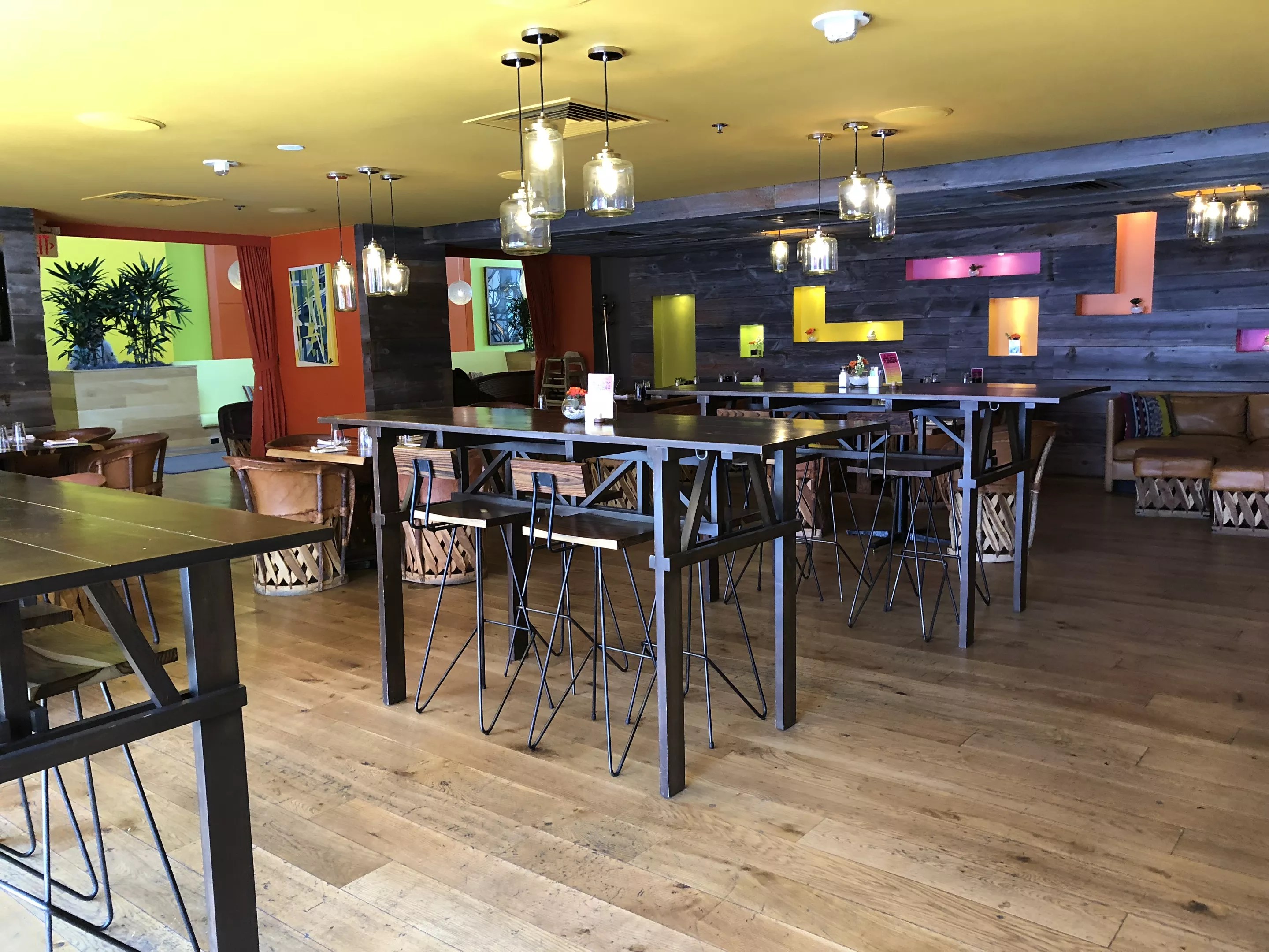 Hashes of color beside windows. The pastel yellow of the entrance. And the pinks, sunset oranges, and yellows of the inner hotel, flaring right on into the cozy restaurant.