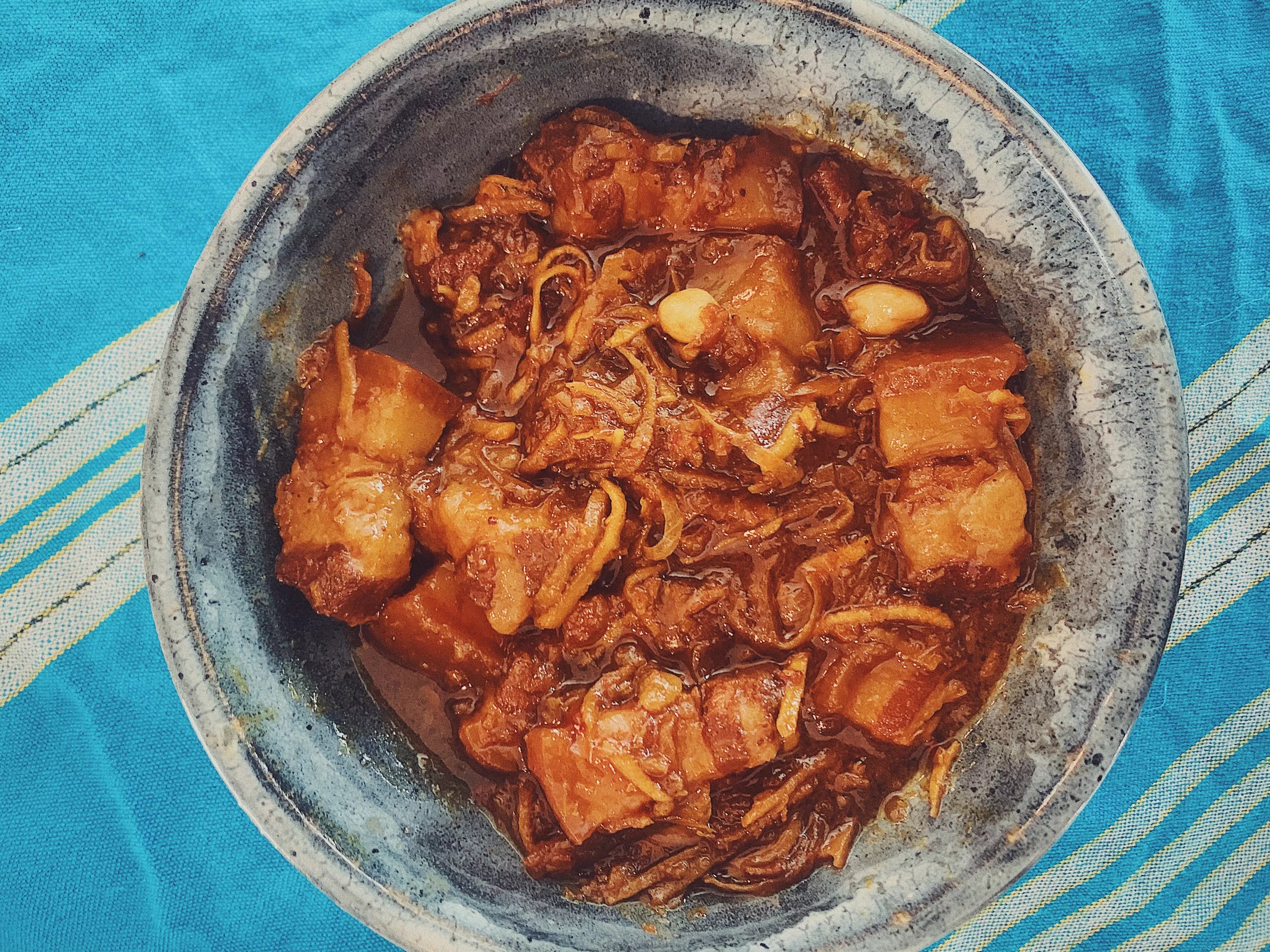 This is food that vibrates with life. Glass noodles stuffed in tender-yet-meaty cucumber tunnels star in a delicate soup (tom jeut tangkwa yat sai mu sap wun sen). Kaeng Hang Lay, a tamarind-accented curry that the Martins say fuses Burmese and Northern Thai styles, was ornate, huge, and delicious – fragrant of lemongrass and delicately spiced, with lime and a galaxy of fragrant botanicals moving back and forth like the swirled inside of a marble, rich, rich, rich with pork belly and soulful leakings of its rendered fat. Easily one of the best things I ate in 2020.