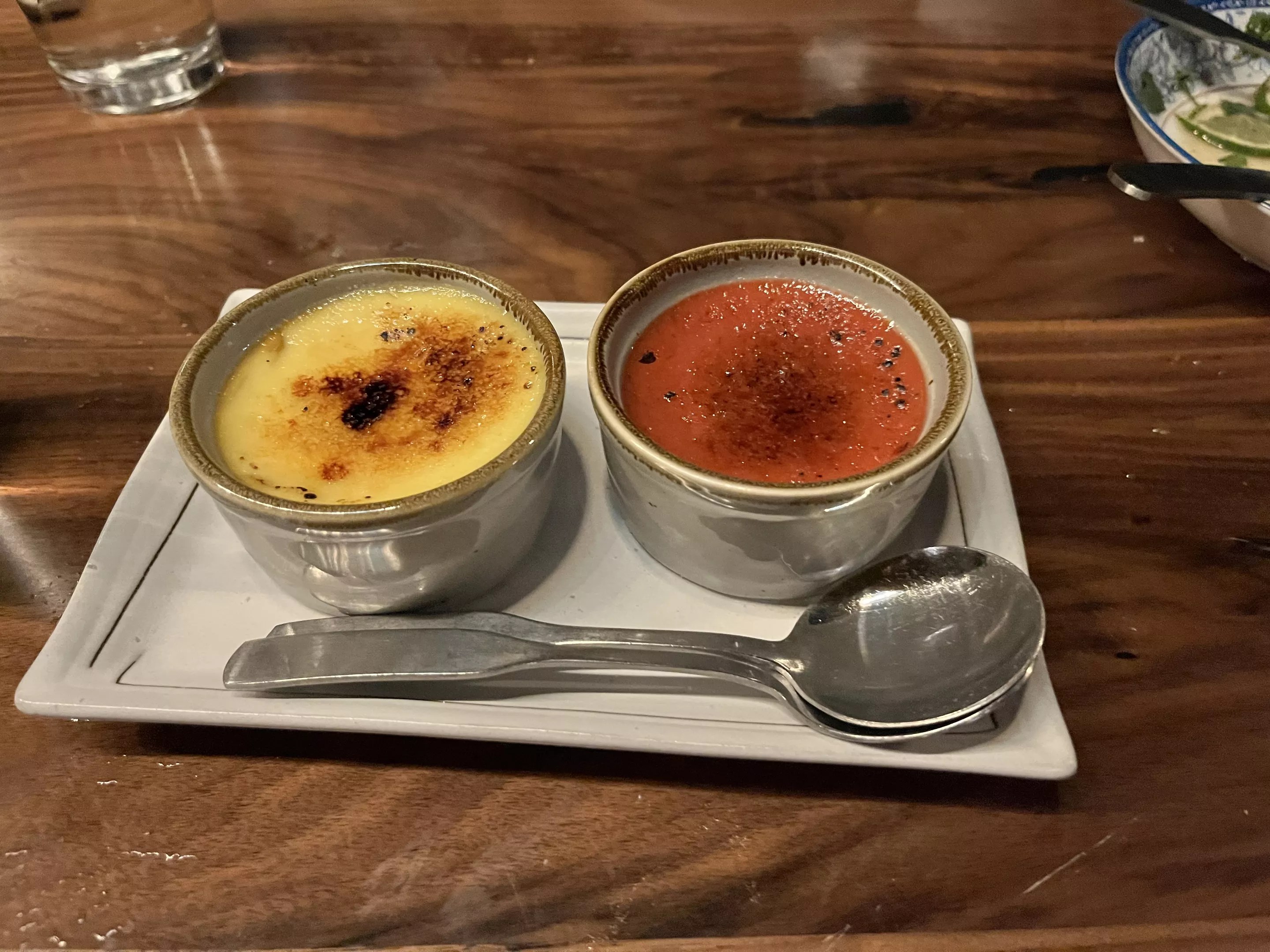 Finally, it was time for dessert. The creme brulee kept it classic, though it was presented in two ways: the Tom Kha, a lemongrass and coconut version, close to the original, but with a twist, and the Roselle, named after a hibiscus species, was milky and sweet with a little bit of tang and a pale pink hue.