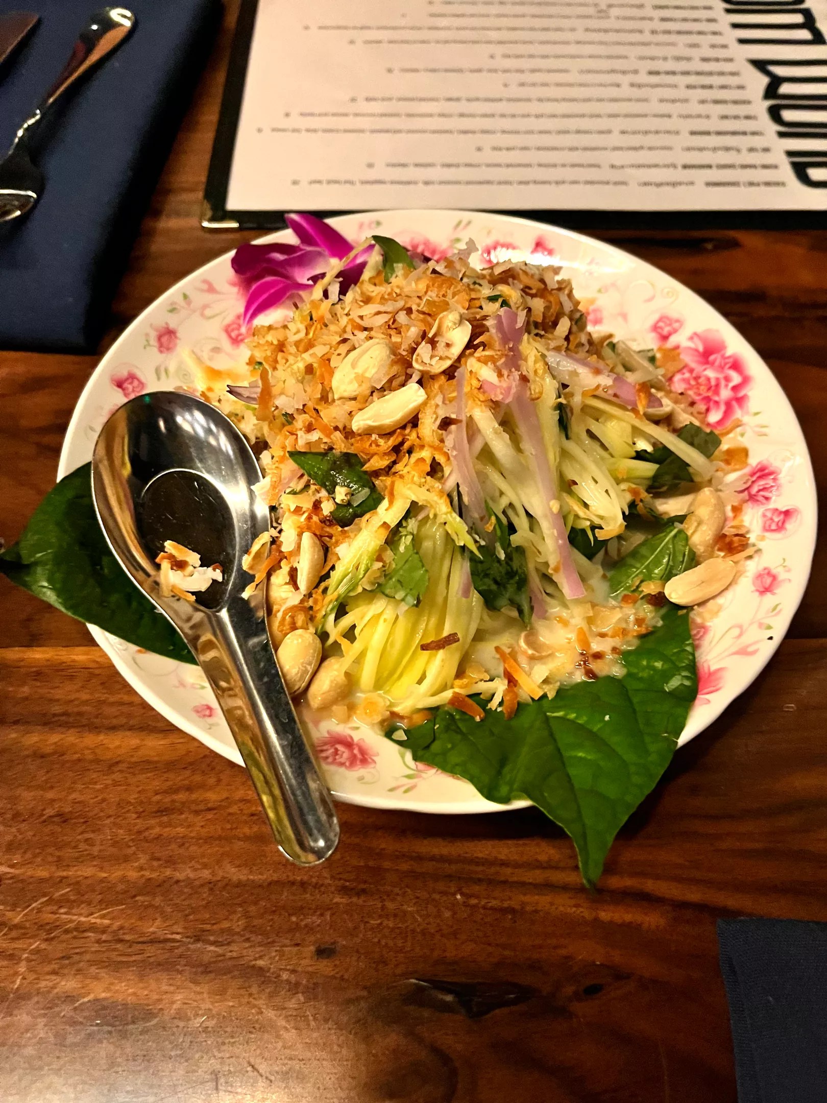 The Gai Tawt Won Pen, crispy fried chicken with Thai chile sauce, appeared last. It was a solid dish, crunchy and substantial, but it paled in comparison with the punchy flavors of its counterparts.