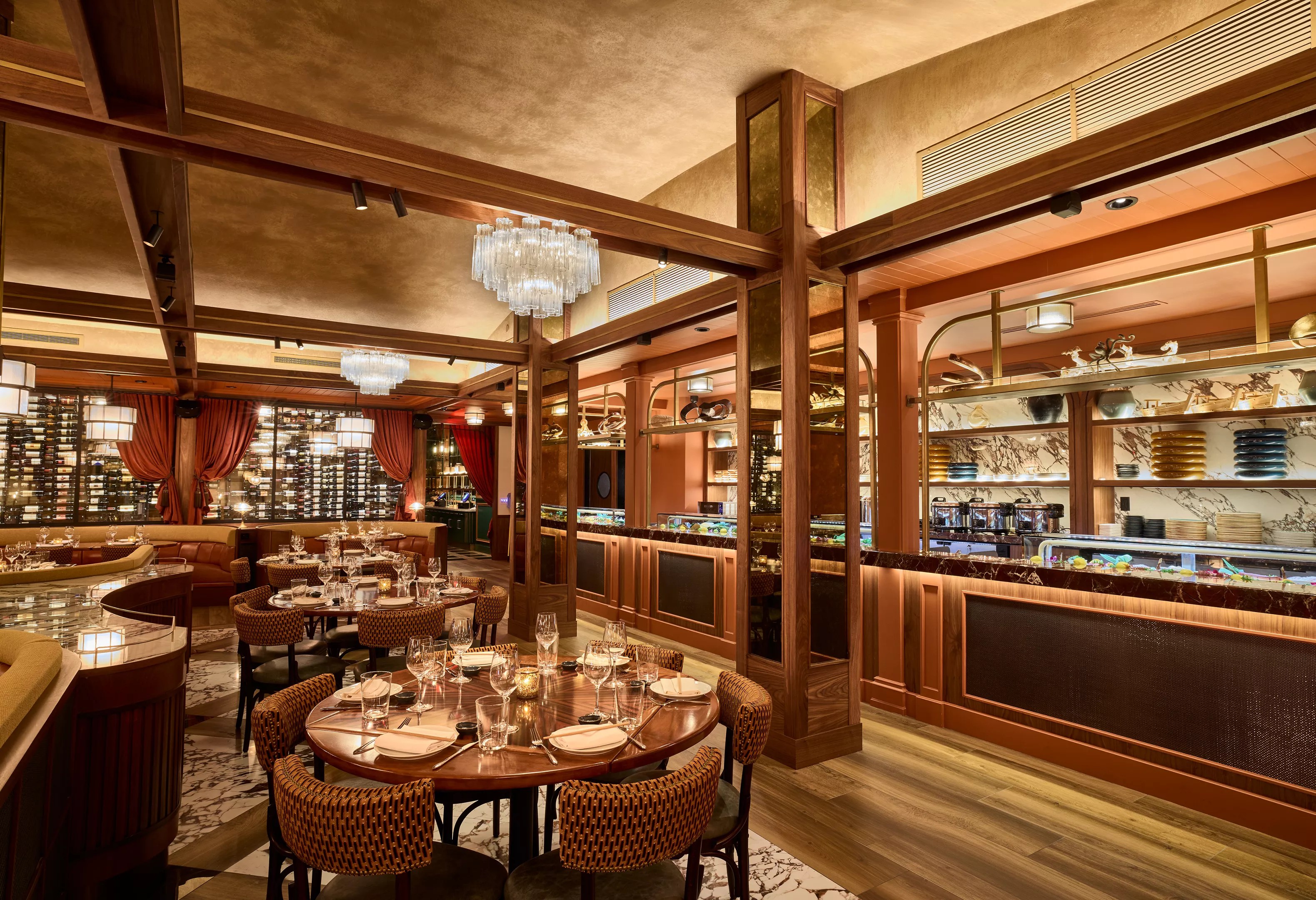 The restaurant’s luxurious dining room, bar, sushi bar and private dining space, including a rich jewel-toned Emerald Room, span 11,700 square feet. The Rockwell Group designed a space that blends desert modernism with a West Coast-inspired palette, using touches of limestone, layers of green, terracotta, wood and oil-rubbed bronze.