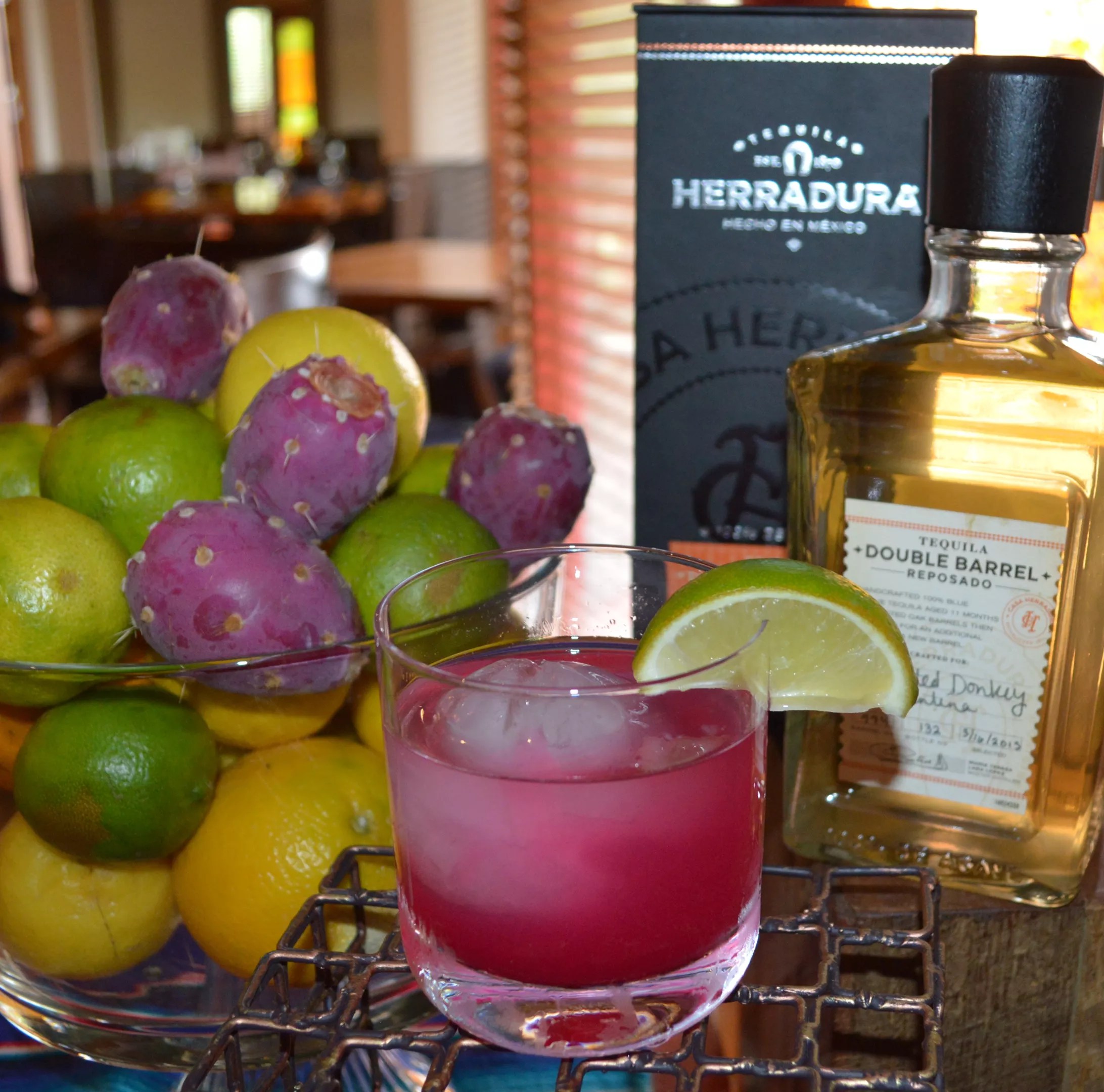 The Double Donkey Prickly Pear cocktail made with Herradura Double Barrel Reposado.