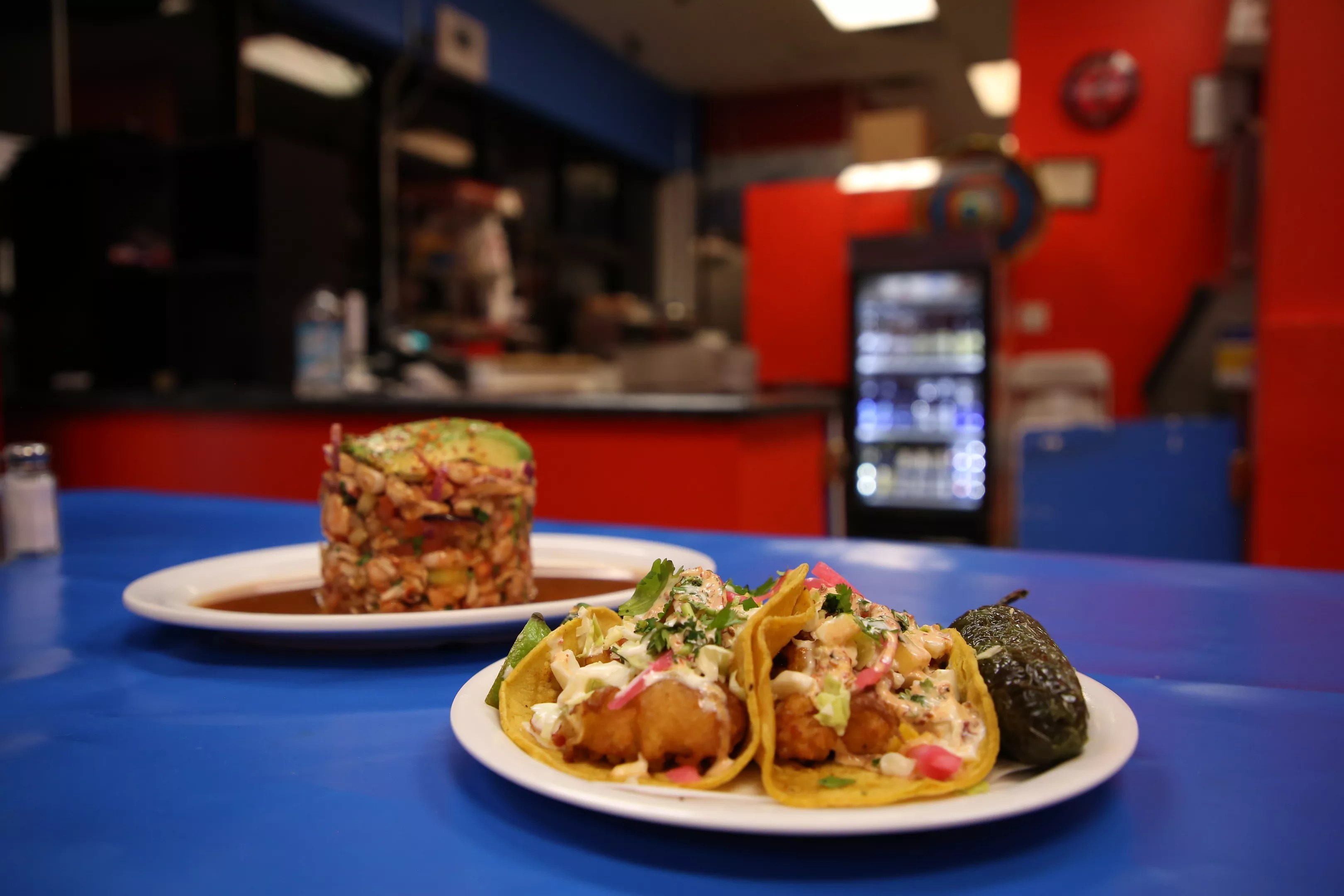 Mariscos Ensenada may be better known for ceviche and micheladas, but they also serve a warm and saucy shrimp taco studded with bacon and cheese, pictured on the left. On the right is a marlin taco served in a similar fashion.