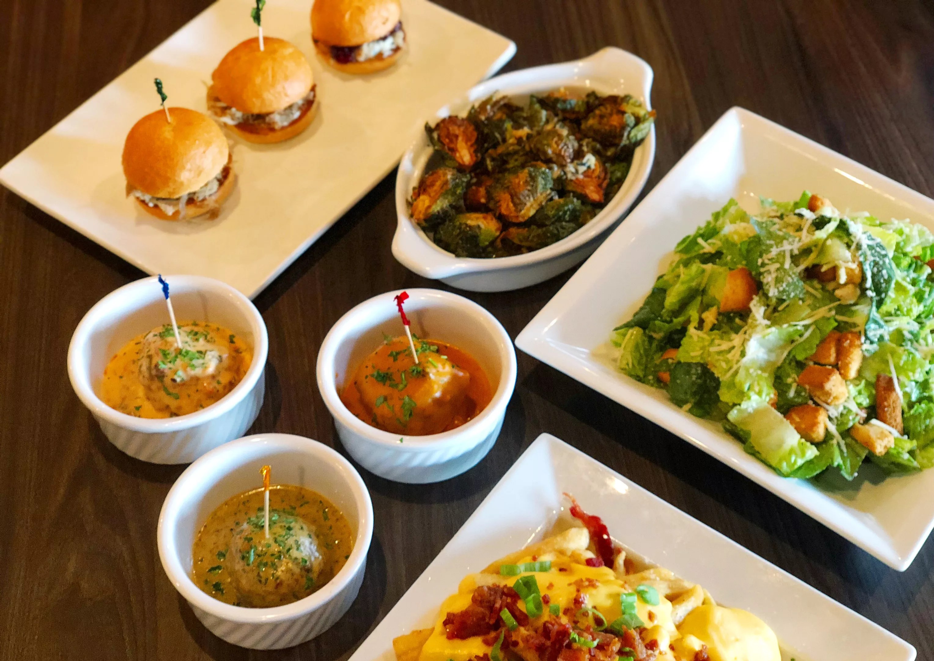 Order meatballs a la carte, inside sliders, or atop indulgent bowls. Vegetable options include Brussels sprouts and salads.