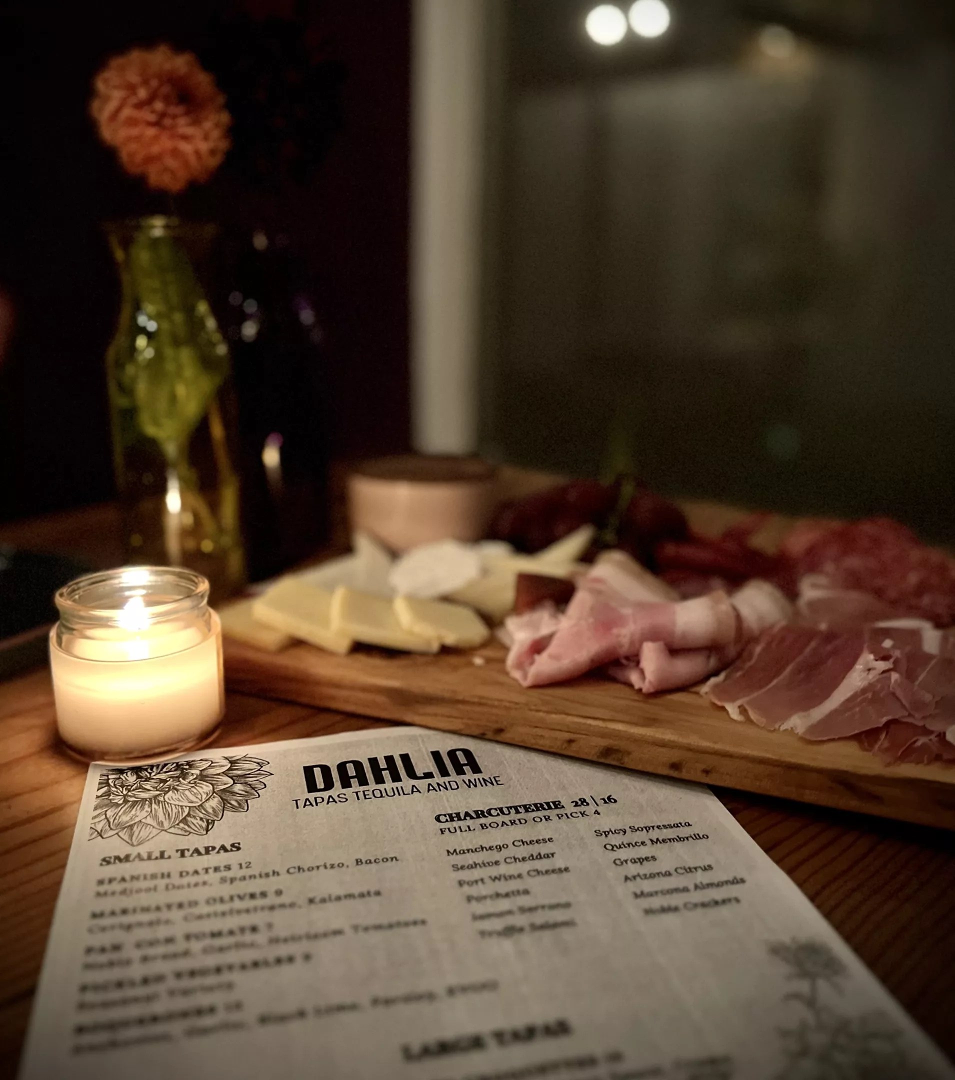 The menu at Dahlia includes small and large tapas, charcuterie board selections, Spanish wines and agave spirits.