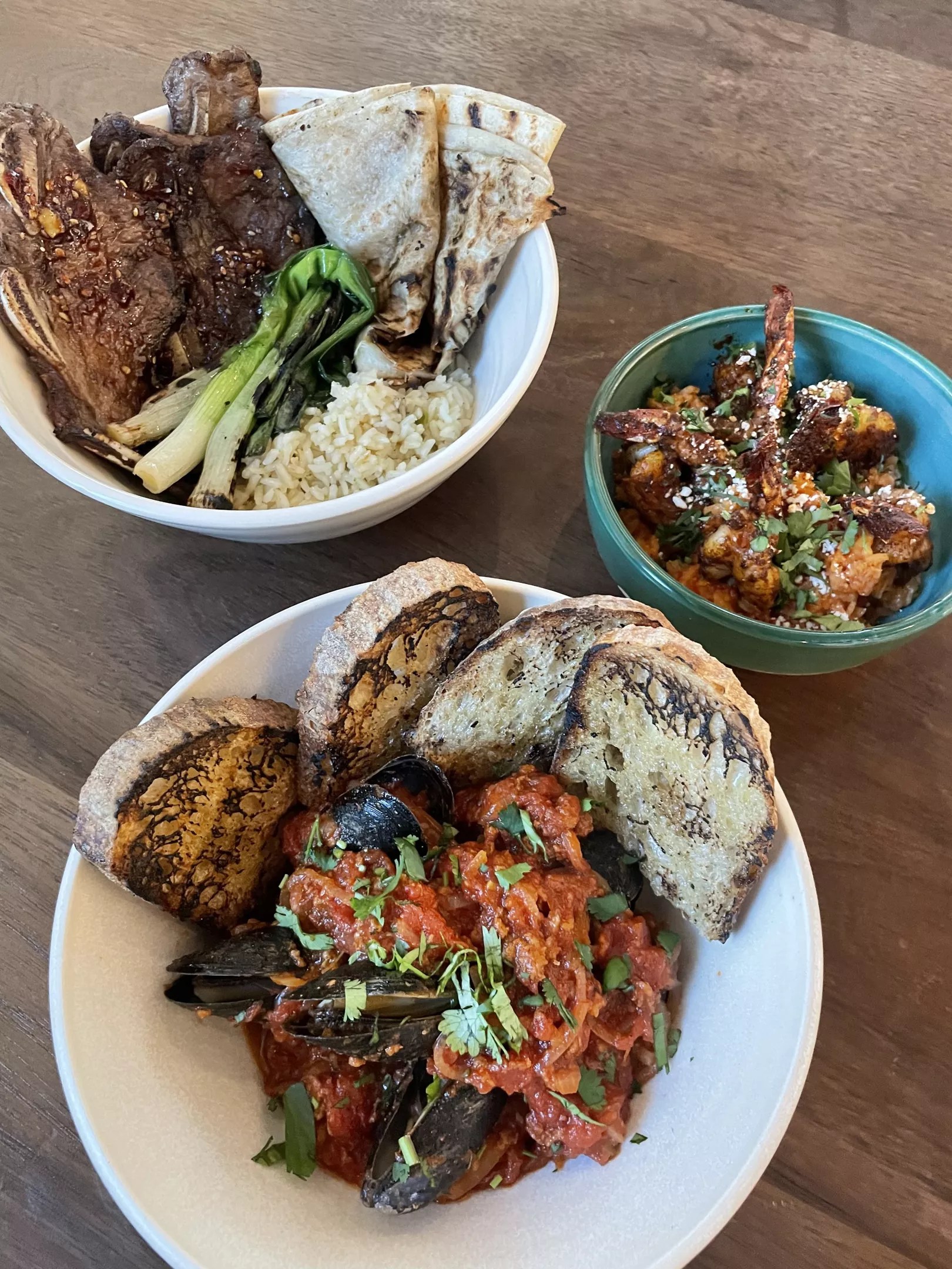 That teamwork is evident on Cocina Chiwas’ menu, which includes dishes such as Costilla de res, a wood-fired beef short rib; Chile Relleno; and Arroz con Camaron – a nod to fried rice with Baja shrimp and salsa macha. Fans of the former Roland’s Cafe will see some familiar dishes, including open-faced quesadillas crisped in the oven, and mussels with house-made chorizo and Bianco DiNapoli tomatoes that are infused with smoke in the oven and served with a crostini of Proof bread.
