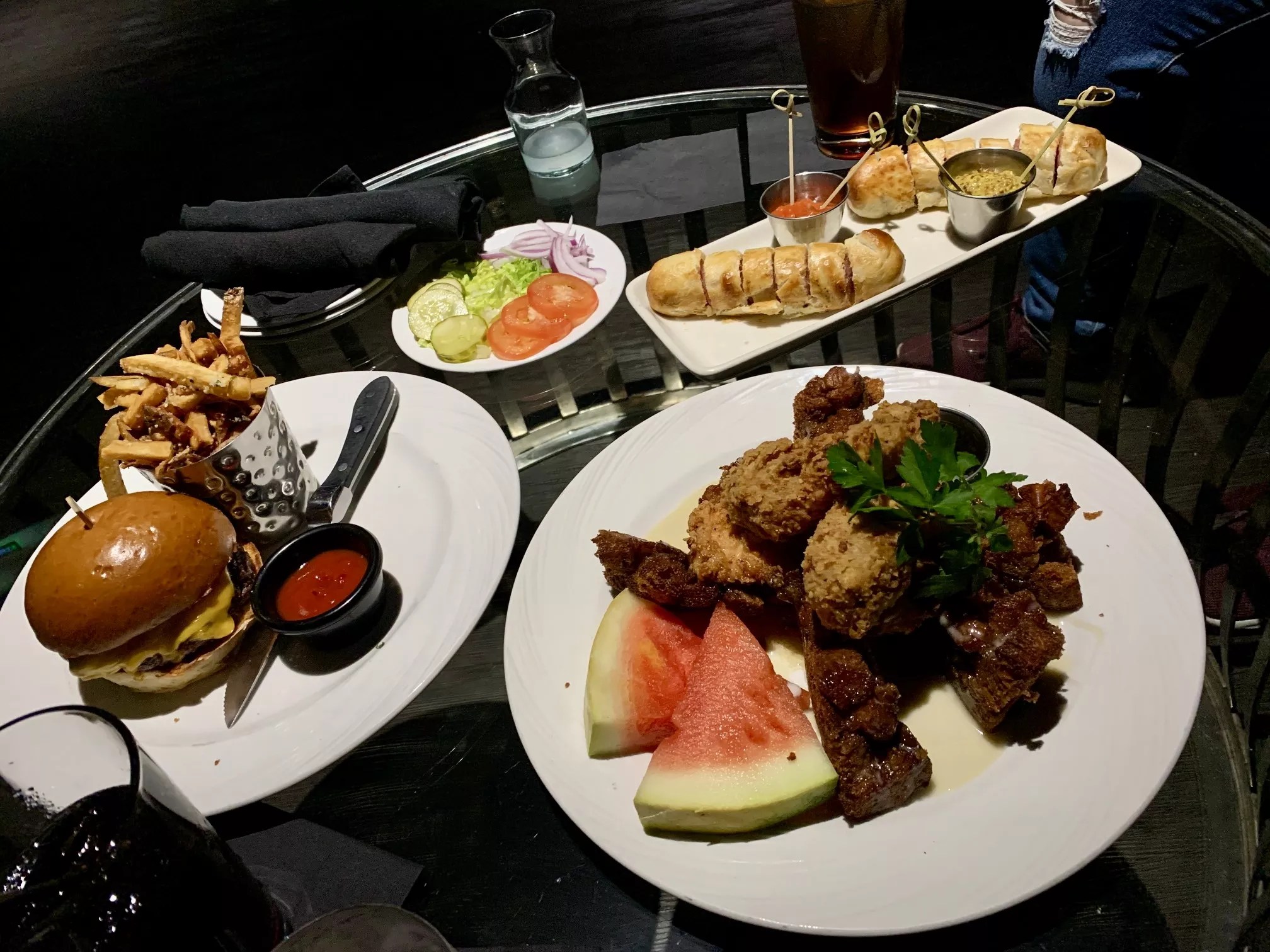 If the crummy acting is no surprise, I’m startled by how tasty the food is here. We’d ordered the Big Shot Burger cooked medium, and it comes nicely pink in the middle and crispy outside, atop a fluffy, garlicky brioche bun fresh from the oven. A side of skin-on fries are hot and crispy and perfectly salted. The Hot Dog Wellington is a fat and juicy frank swaddled in cheddar and baked in fluffy puff pastry.