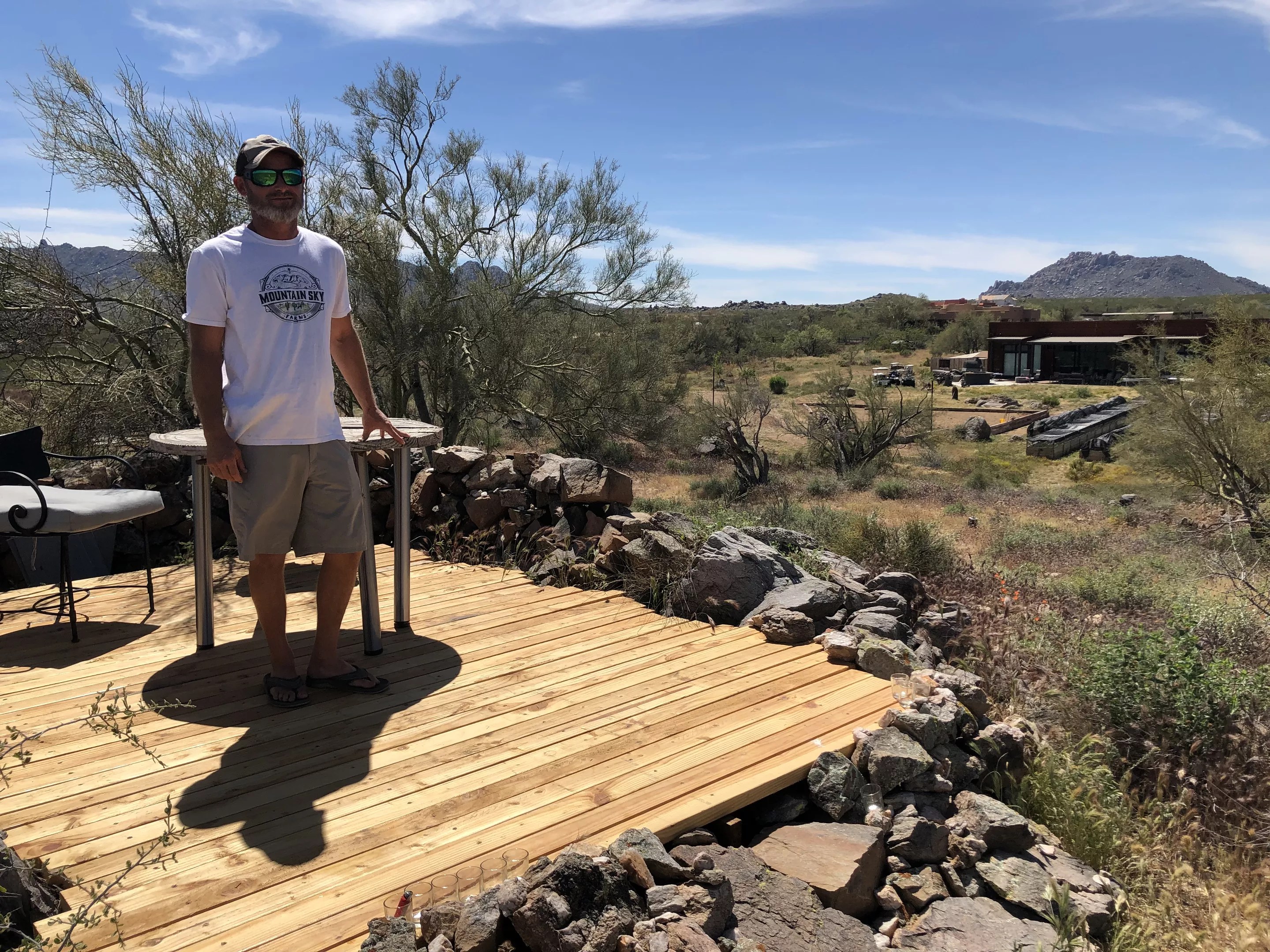 Naughton farms open, hardscrabble land east of Troon in far North Scottsdale. Walking out from his rusted modern farmhouse, you see his grow house, greenhouse, and raised garden beds covered by tarps fidgeting and sailing in the wind. Even when that wind is a breeze, it seems to carry a primal force over the scrub of the parched earth. Past the beds, up a candled trail curling to the apex of a rock outcropping, there is a table for two. Naughton often eats here with his girlfriend when he can catch a break. Stark mountains – Black Mountain, the Mazatzals – march far in the distance. The sky is close.