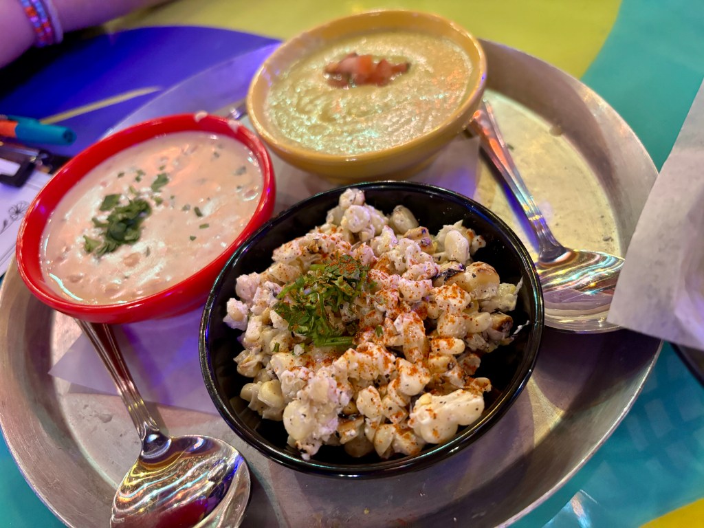 The drinks list is as expected, including a dozen different flavors of margaritas, a few fruit-forward cocktails and a selection of agave spirits. The surroundings beg for a margarita, appropriately served in a giant, sturdy glass with a glistening rim of salt.