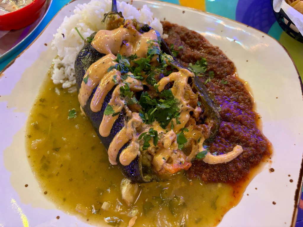 A tender, roasted poblano is stuffed with marinated chicken, shredded cheese and pico de gallo. So far, fairly standard. But then cubes of dried apricot and spicy walnuts join the party, bringing sweetness and crunch. The whole thing is drenched in chile verde sauce and roasted red salsa and served with white rice.