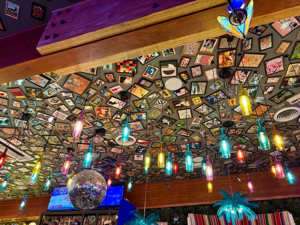 Tiffany lamps in the shape of parrots and butterflies hang overhead. And in the middle of it all, somehow, a massive, glittering disco ball almost blends in.