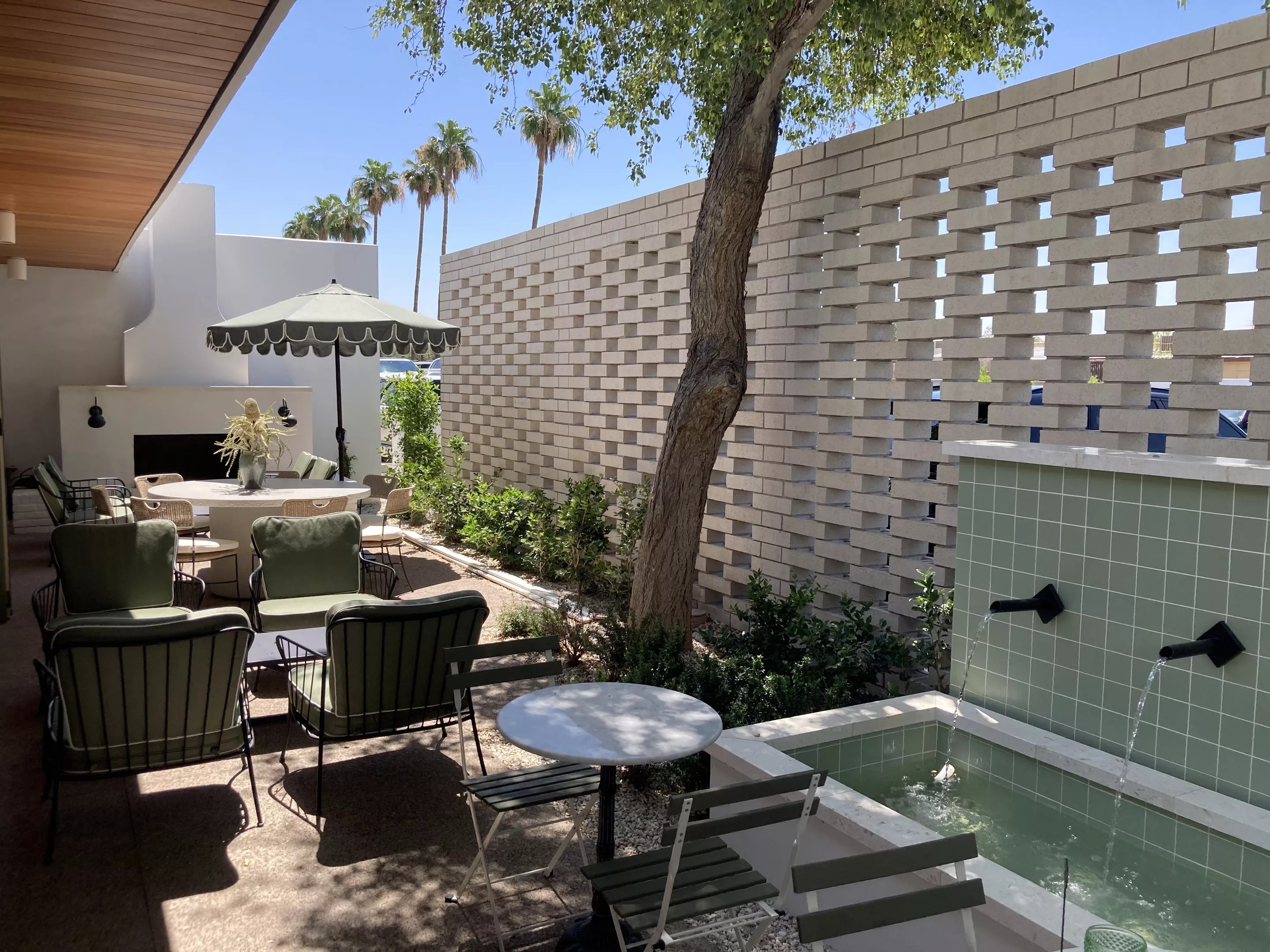 The patio of Lydia’s includes water features and a fireplace in the signature mid-mod style of The Frederick.