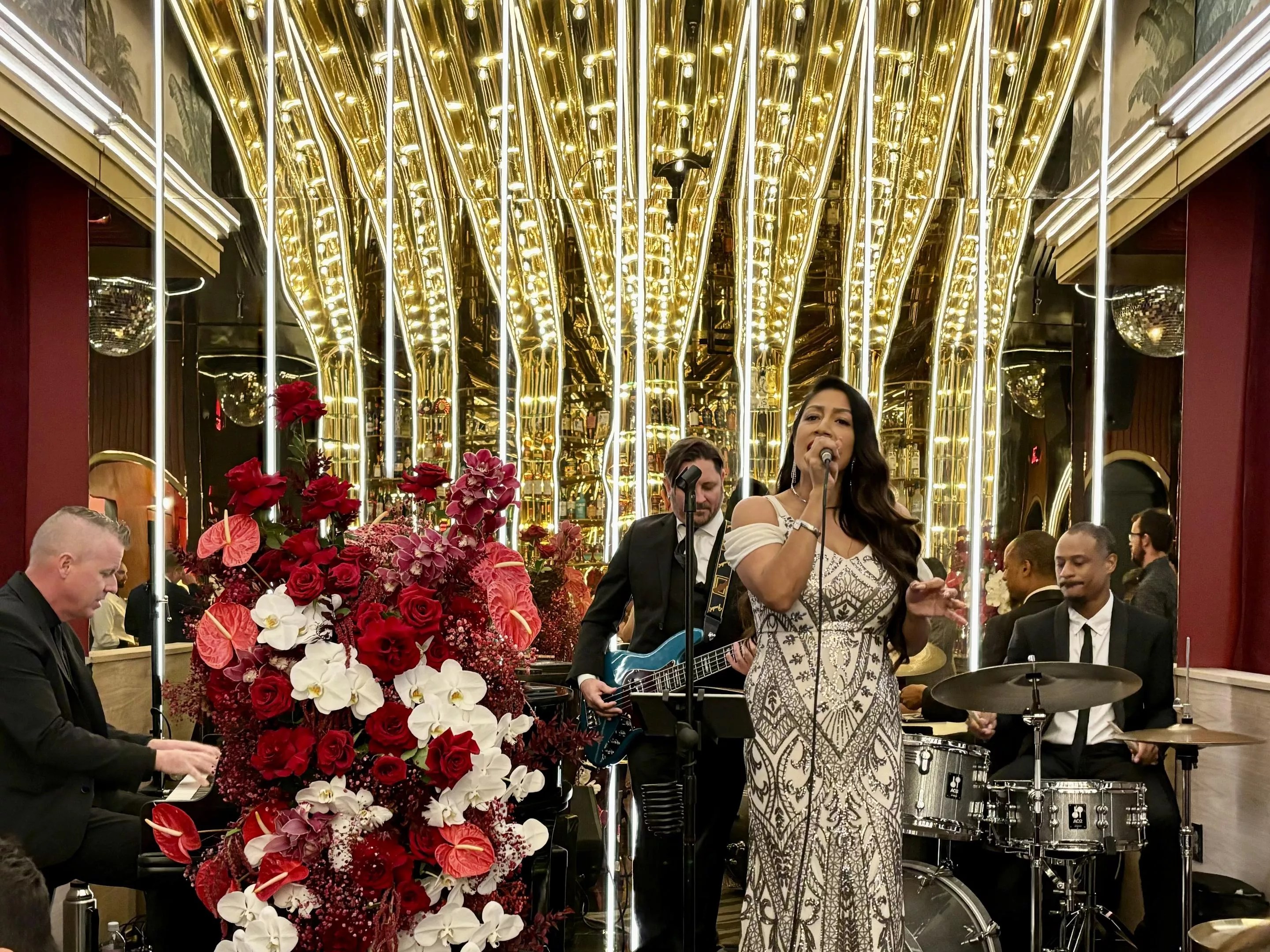 There’s a lot to take in. The exuberant pop of Champagne bottles can be heard over the gentle hum of music and chatter. A glistening gold ceiling stretches from the stage to the expansive black stone bar. Arched walls punctuate the room with white tubed lighting.
