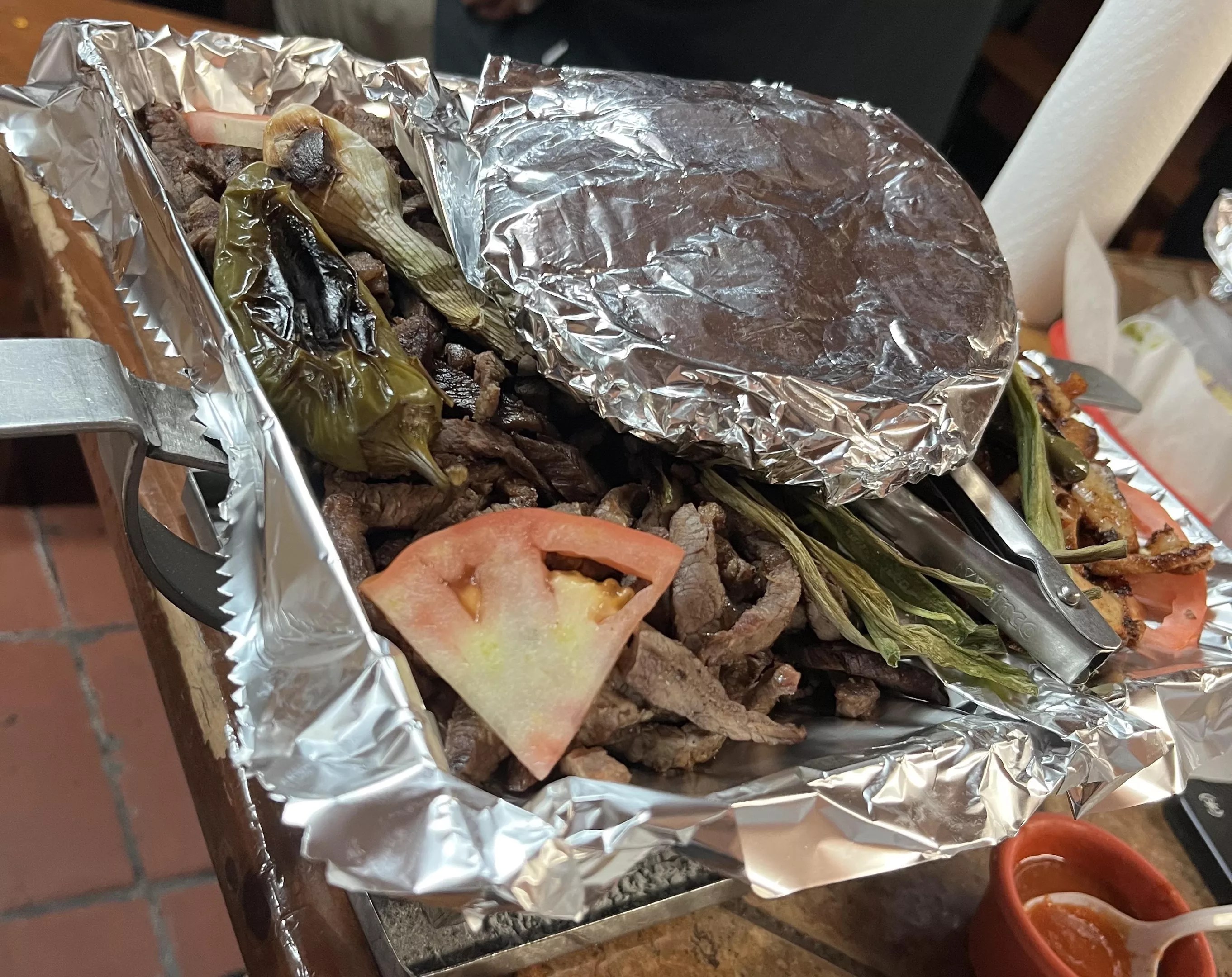 Placed atop the wood-and-tile tables, the parrillas were surrounded by sides of rice, beans, flour tortillas imported from Mexico, veggies, guacamole, red house salsa, and frijoles a la charra, a homemade soup with pinto beans, bacon, cilantro, and onion.