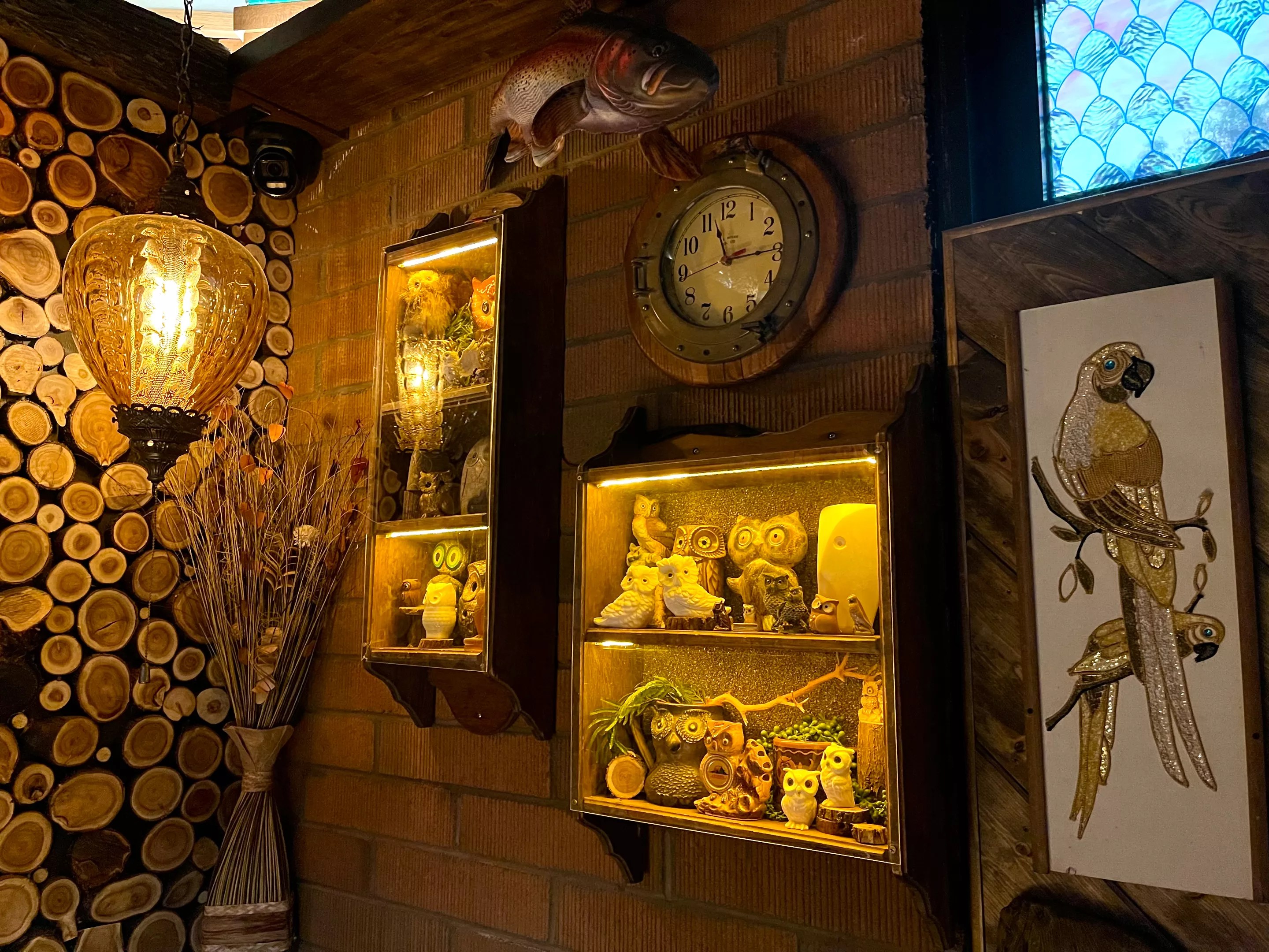 Cozy booths line the wood-covered walls decorated with tchotchkes, many of which are owl themed, following the restaurant’s name. There are paintings of owls, little figurines, carvings and, in the center of the square bar, a spotlit bird that slowly spins.