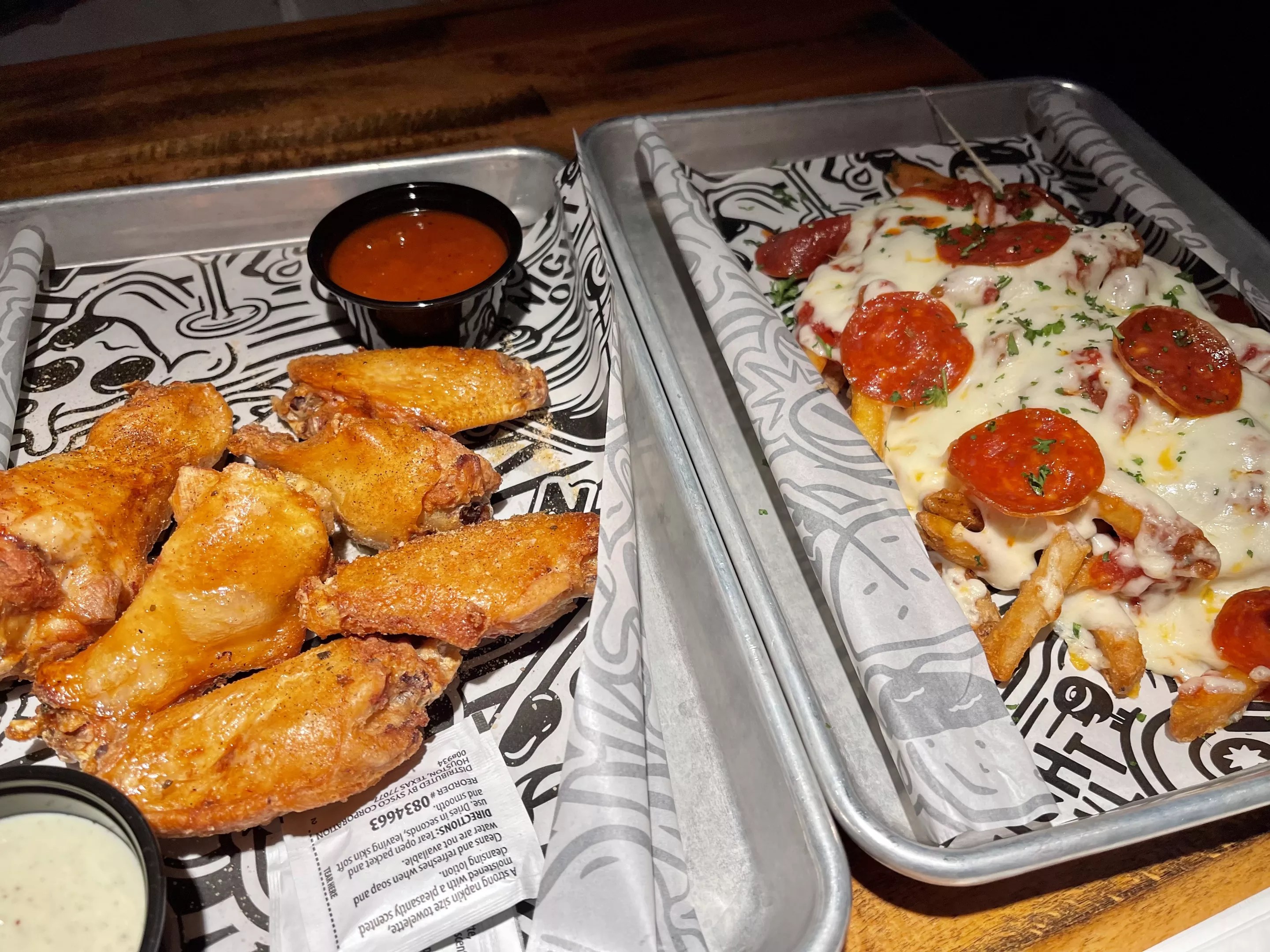 Wings are served by the dozen or half dozen, and the loaded fries are a meal in their own right.