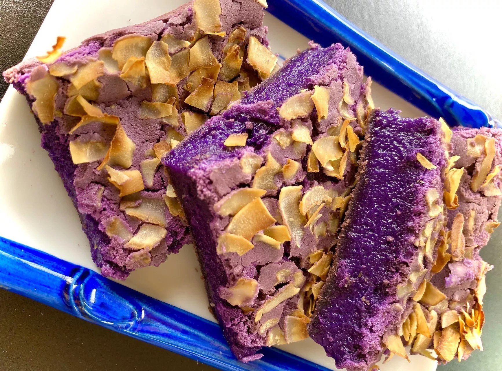 One recipe: The ube butter mochi, a twist on the Hawaiian butter mochi (akin to a brownie). It’s moist and chewy with the creamy coconut flavor of ube further enhanced by toasted coconut. Another: the Ube Samoa Rice Krispies, a riff on the Girl Scouts Samoas and Rice Krispies Treats. It’s a gooey, marshmallowy square dipped in chocolate and sprinkled with toasted coconut. The third mix is for ube mochi pancakes and/or waffles (which are gluten-free, by the way).