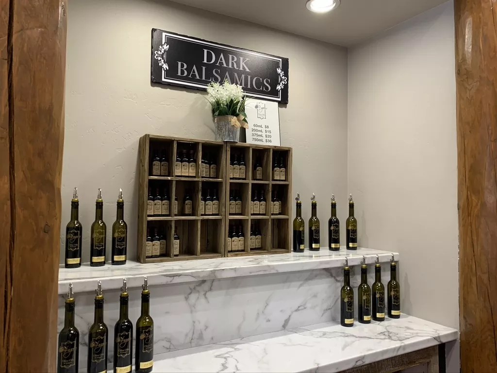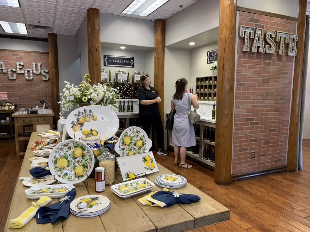 Just browsing the shop is a multi-sensory experience. Bottles of white and dark balsamic vinegars are arranged on the left side, and the oils are on the right. As you wander the store, your eyes pick up the variety of labels announcing fused and infused items. Possibilities abound, with a grapefruit balsamic vinegar here, a pomegranate one there. There’s even an espresso vinegar, which you can drizzle on ice cream.