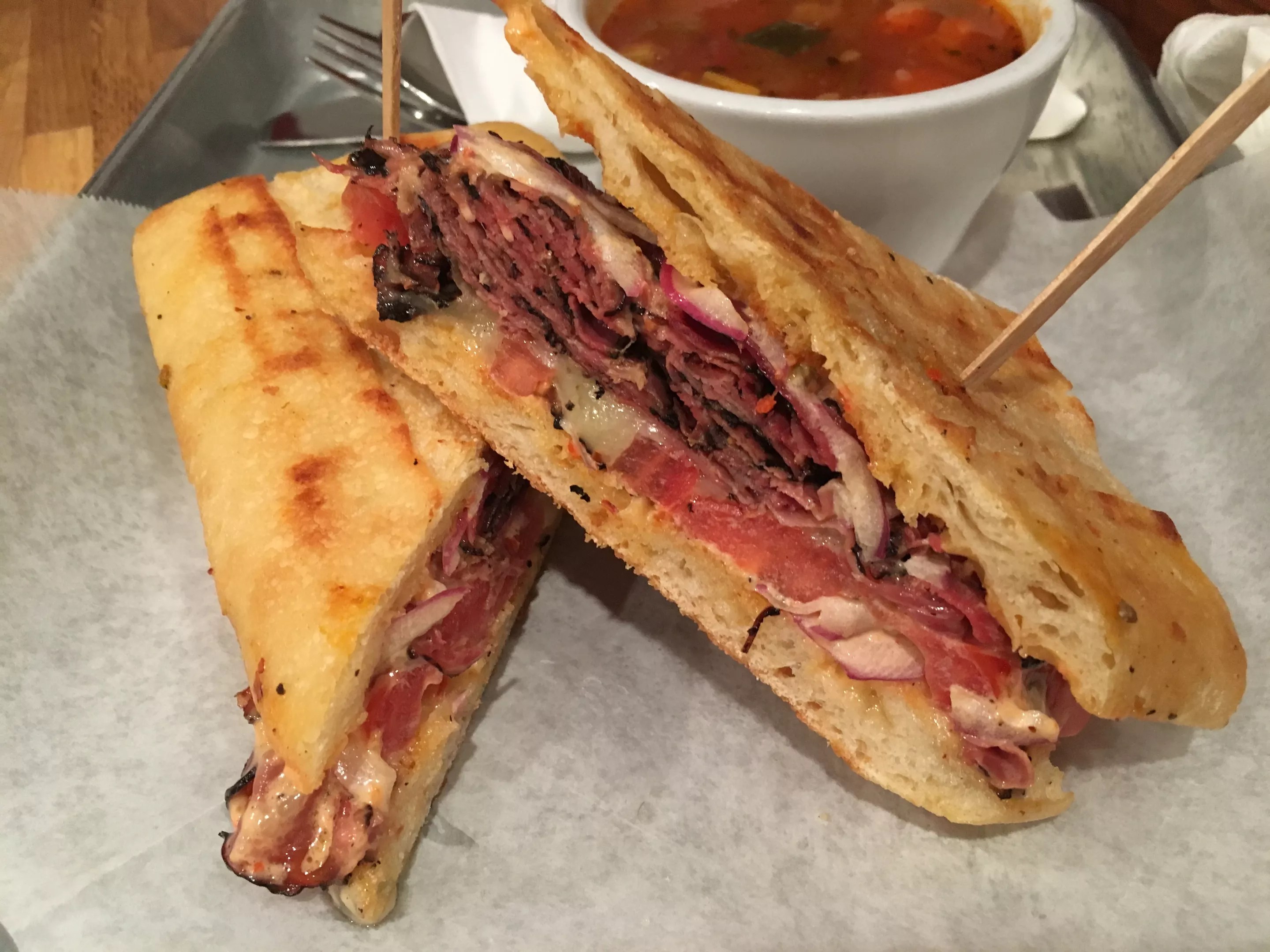 A brisket panini takes its cues from a shaved beef sandwich Ally had in Sorrento. She (or Carlos) presses that panini, stuffs it with thinly sliced brisket, red pepper aioli, and tomato, and presses it again. It’s a fantastic panini. The bread is made in-house. It even comes with a side of minestrone (if you opt for soup instead of salad), making for a comforting homestyle meal.