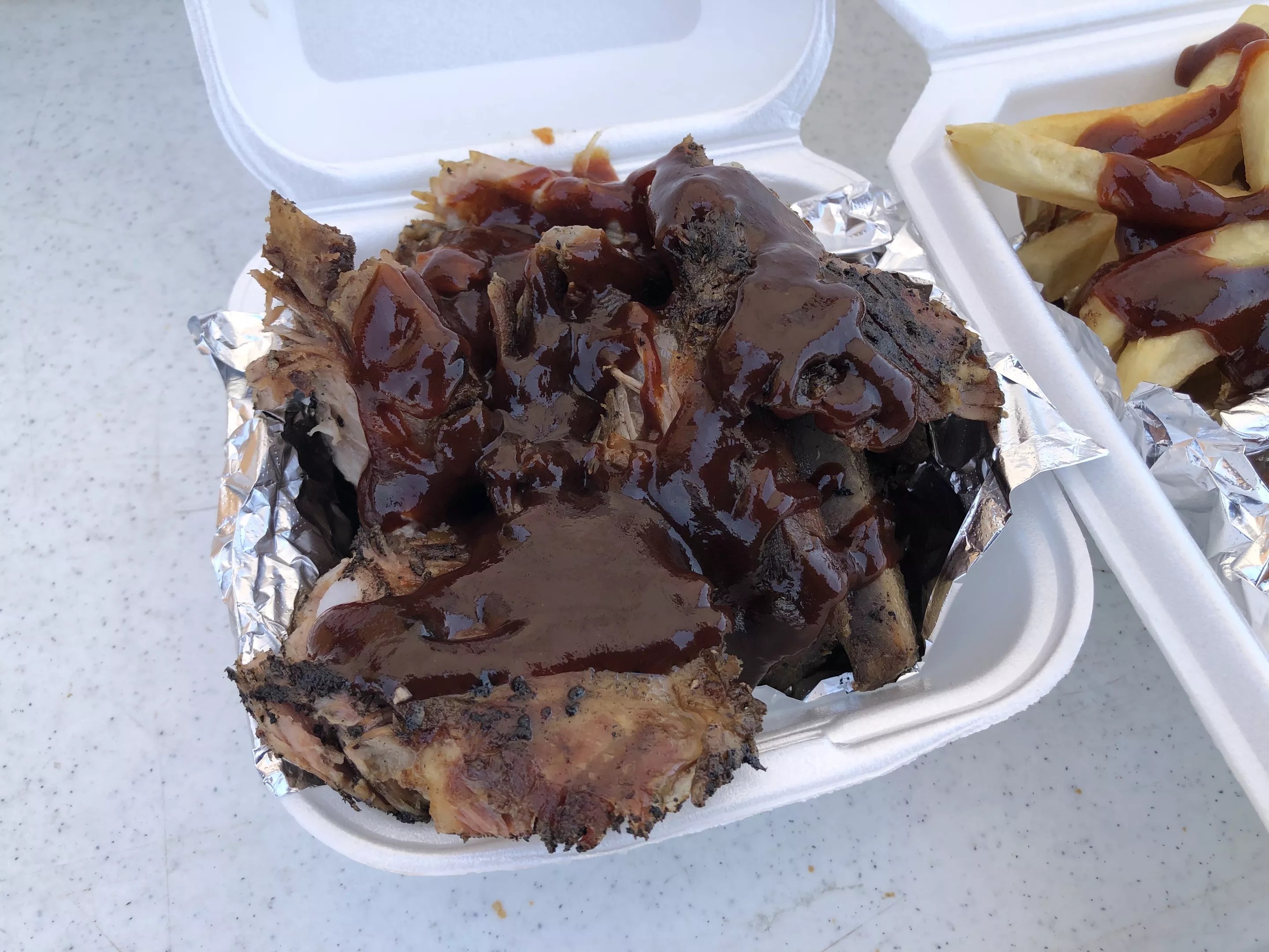 Fried chicken wings, fries, and rib tips outside of Holy Haven Ministries.