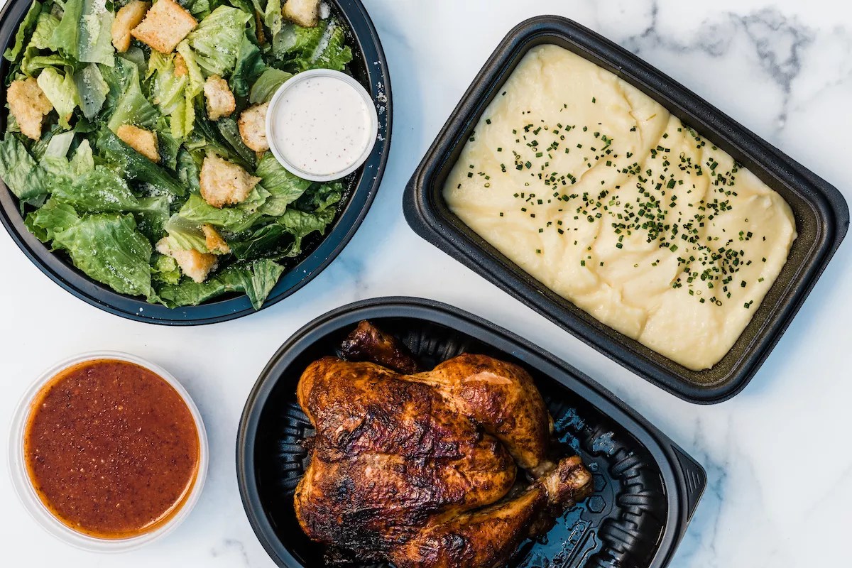 The Family on the Fly meal deal at Doughbird is simple yet sophisticated. It comes with a whole rotisserie chicken (duh), but this ain’t just any bird. It’s a slow-roasted, free range chicken that’s spiced and spit-cooked until crackling and colorful on the outside and all juicy on the inside. It comes with a large sauce for smearing or dipping (think pineapple teriyaki, jalapeno pesto, or chipotle barbecue) a crouton-topped Caesar salad, and a choice of broccoli, mashed potatoes, or mac and cheese. All for – drum roll please – $32 bucks (to-go only).