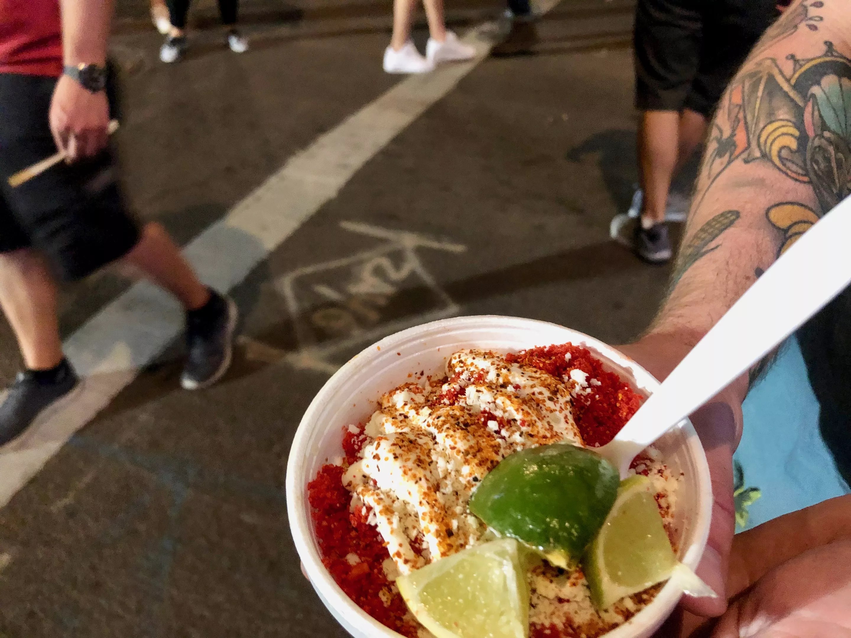 Next was street food. The option to coat something in Flamin’ Hot Cheetos was everywhere, but Elote Man AZ had something others didn’t – reasonable prices. A generous cup of elote came heavily dusted in the dark-red Cheetos crumbles, cream, and wedges of lime. But the best part? Only $6.