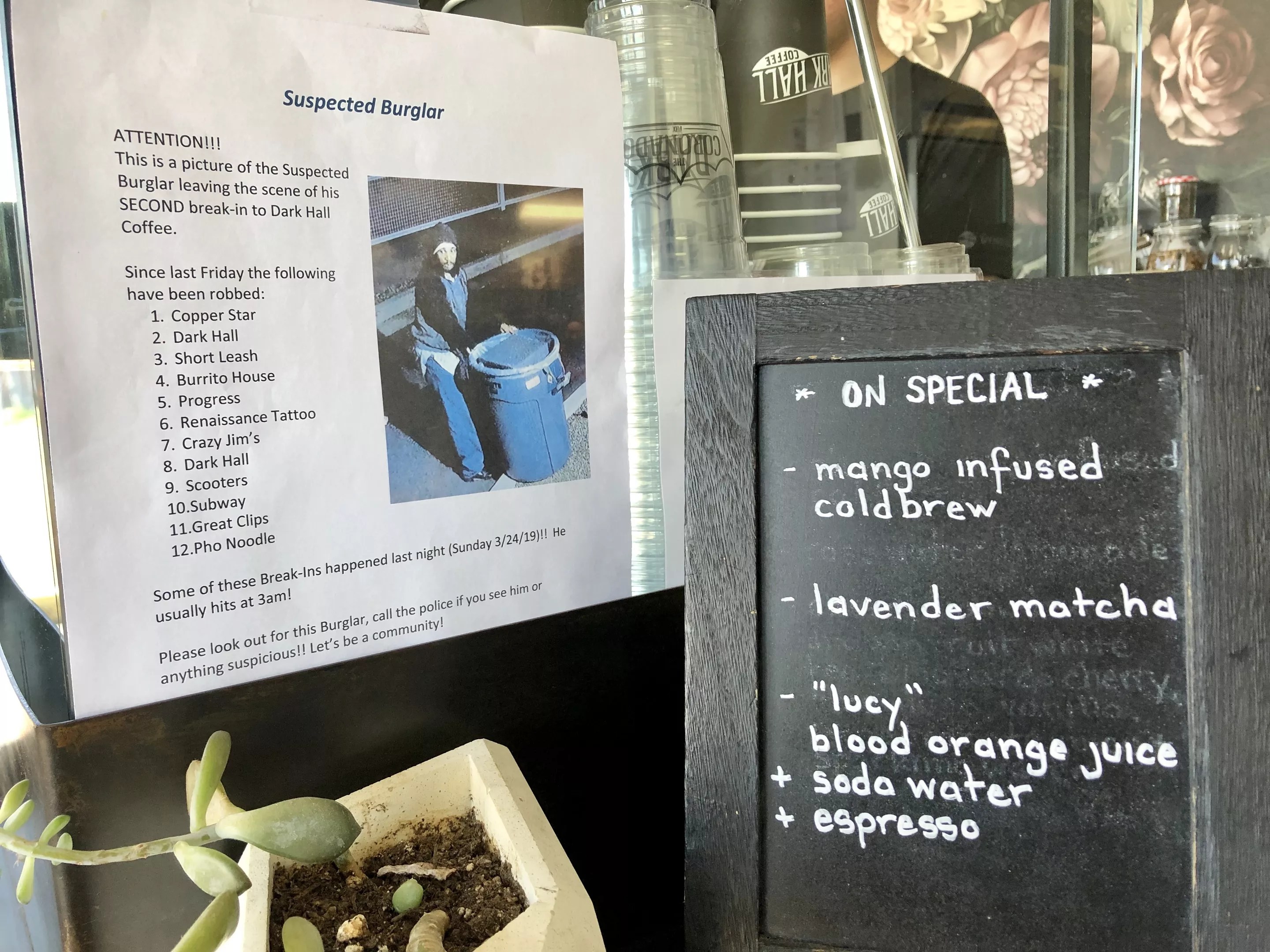 Dark Hall Coffee, the independently owned vegan coffee and pastry shop at Seventh Avenue and Osborn Road, has unfortunately become the star of this particular crime spree. As of now, it is the only business to have been broken into twice.