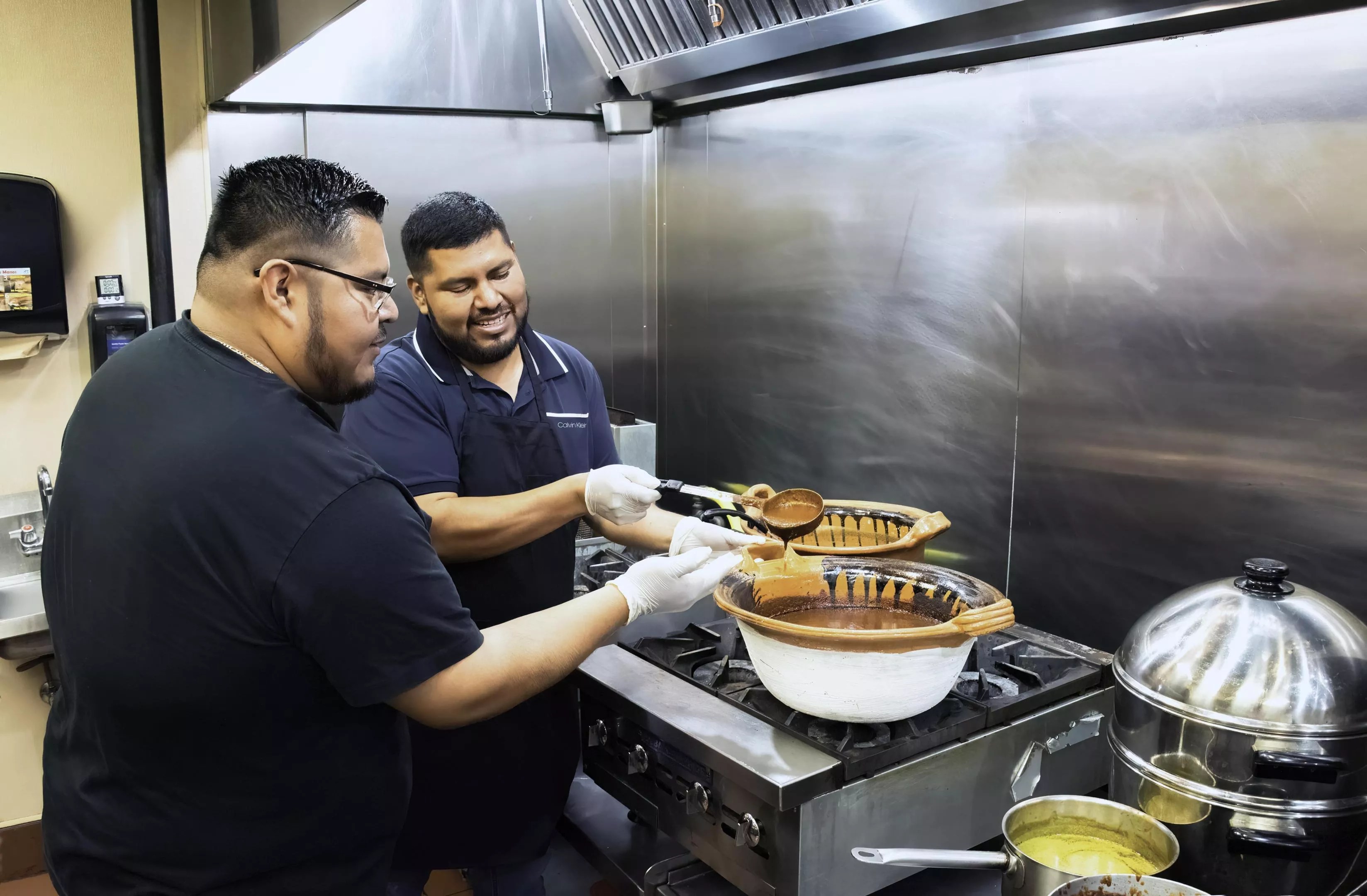 Brothers Felipe (left) and Guillermo T. Agustin in the kitchen of their restaurant, El Rincon Poblano. Family recipes, such as the mole poblano and pipian, are cornerstones of the menu.