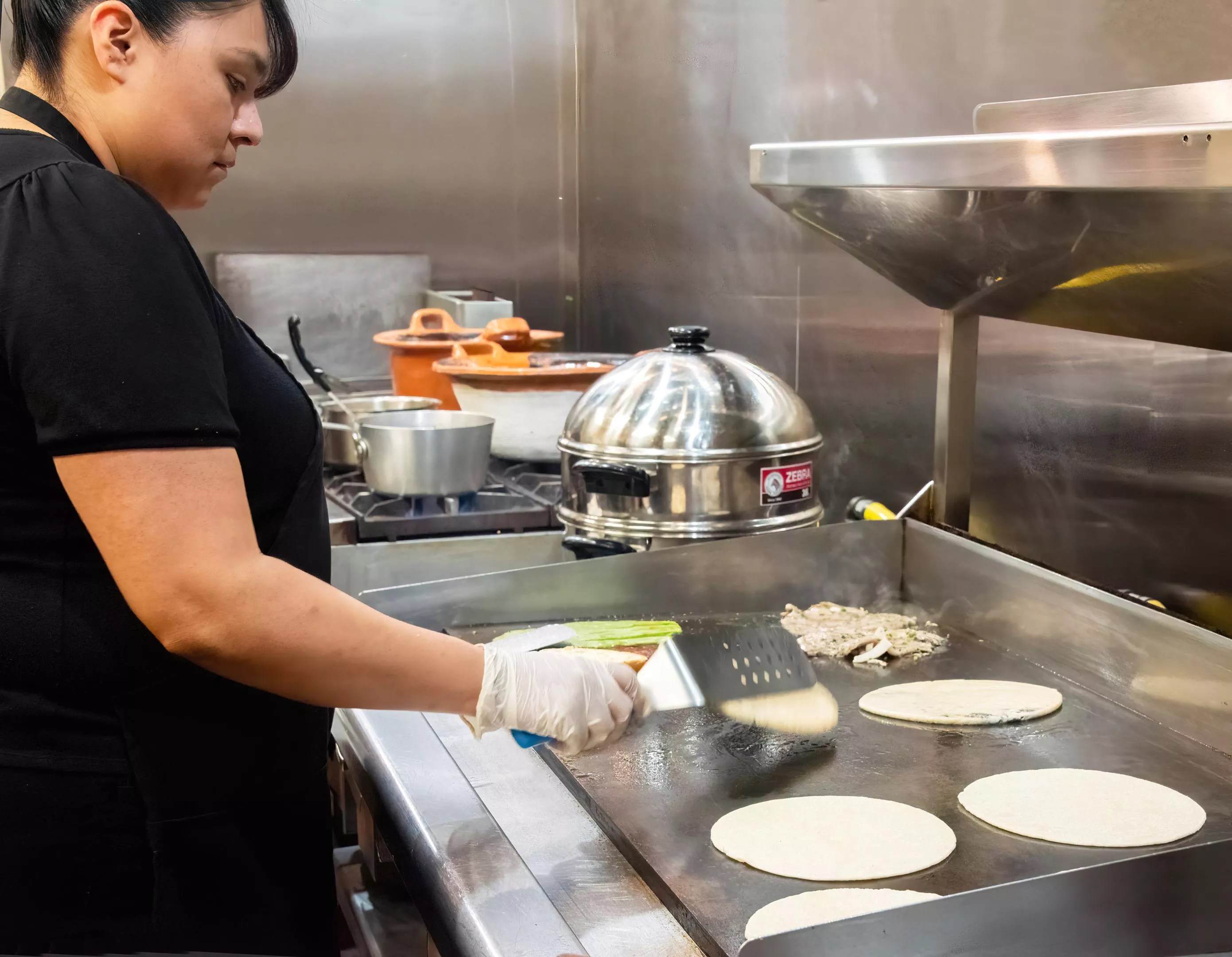Noemi Merino, the wife of co-owner Guillermo T. Agustin, flips tortillas on El Rincon Poblano’s flat top. The restaurant goes through about 150 pounds of corn each day for its tortillas.