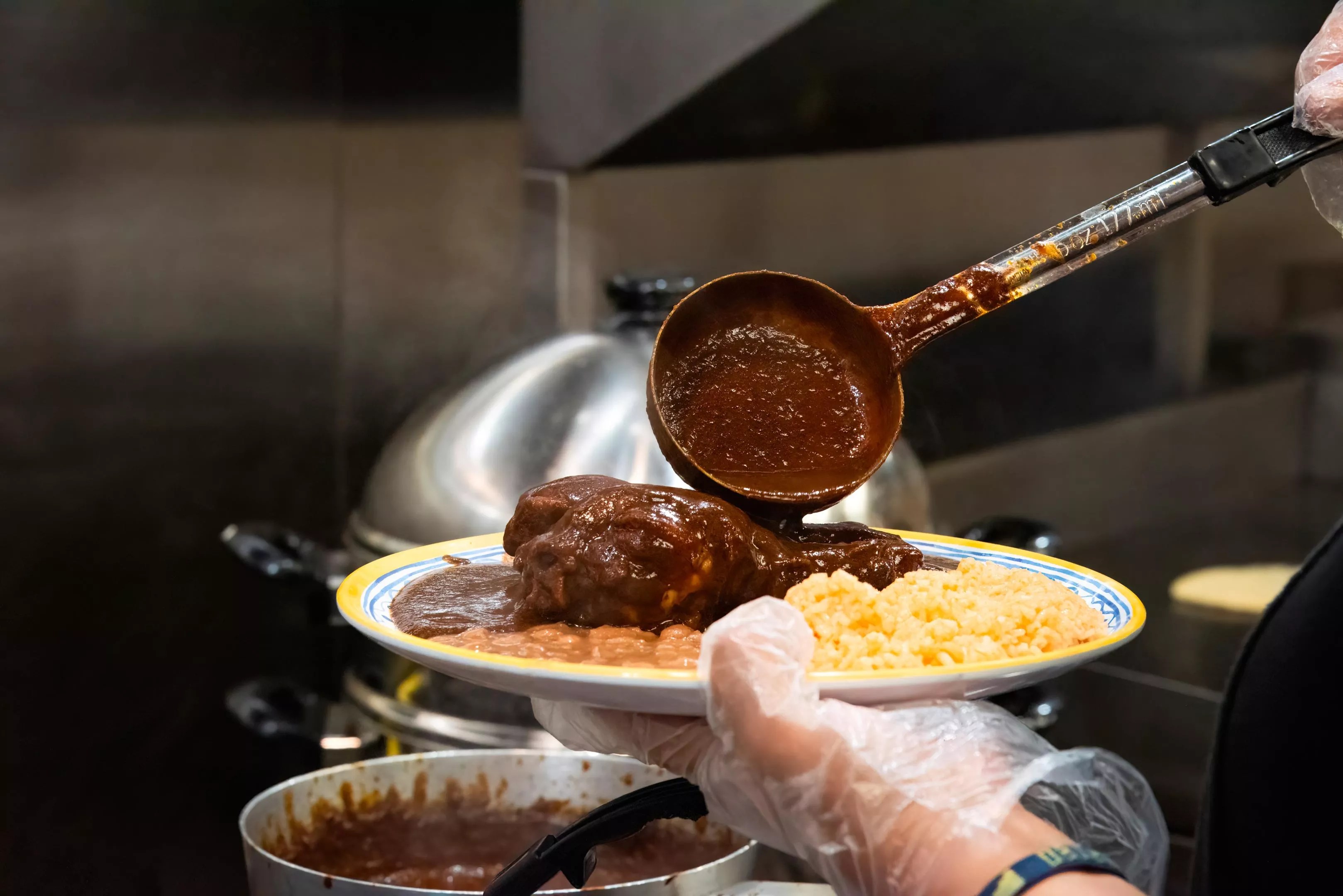 Though there is debate on whether mole originated in Puebla or Oaxaca, one origin story is of a nun at the Convent of Santa Rosa creating the dish in the 17th century at the behest of a visiting dignitary. At El Rincon Poblano, the sauce is made in a large clay pot with various chiles, sesame seeds, spices, garlic, chocolate, plain Mexican biscuit cookies, fried tortillas and plantain.