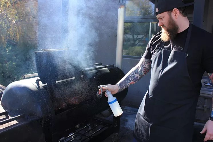 Dom Ruggiero spraying pork shoulders in a 120-gallon smoker.