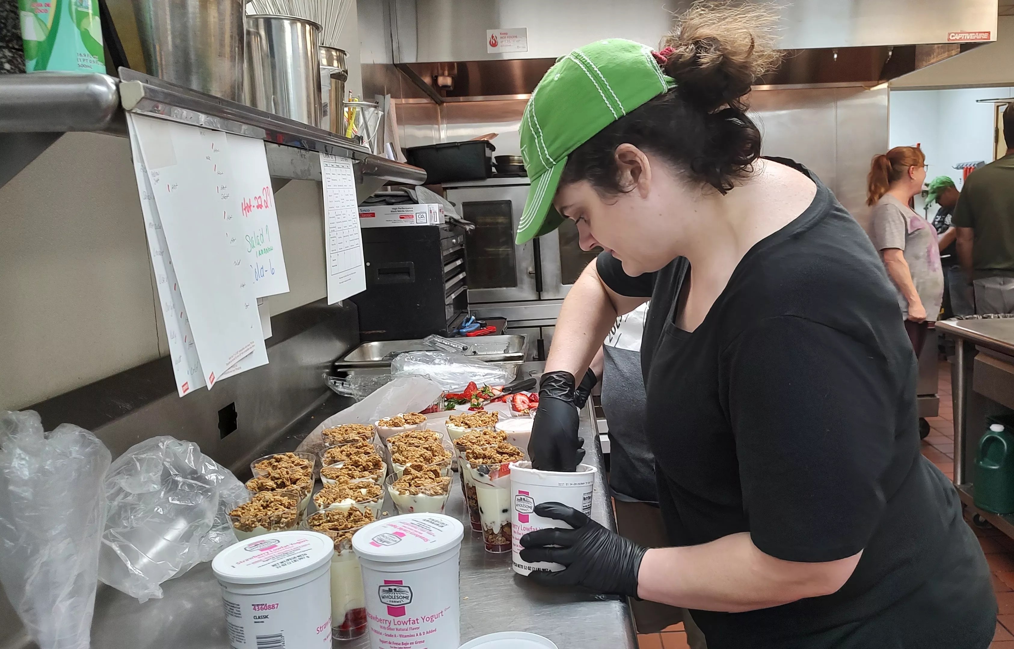 Civitan member Jessica prepares desserts in the commercial kitchen at Civitan Village as part of the organization’s culinary program, where members prepare, cook, bake and serve thousands of meals each year in the community.