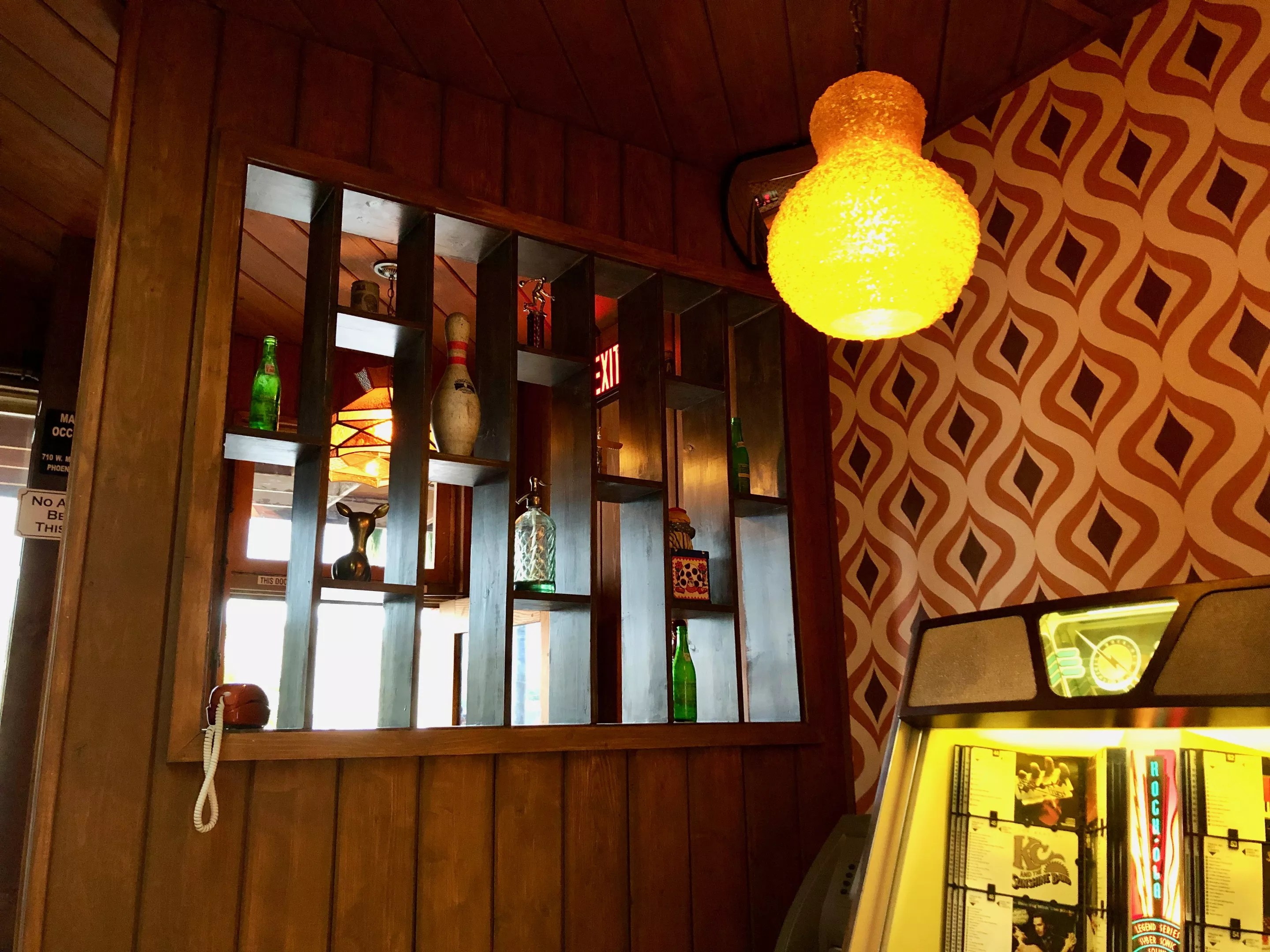 Several vintage arcade machines are lined up and set to free play. The ATM dispenses singles and fives for the jukebox, and cigarette machine. There are three half-circle booths backed by rocky, Arizona stone walls – another callback to the neighborhood taverns of yore.