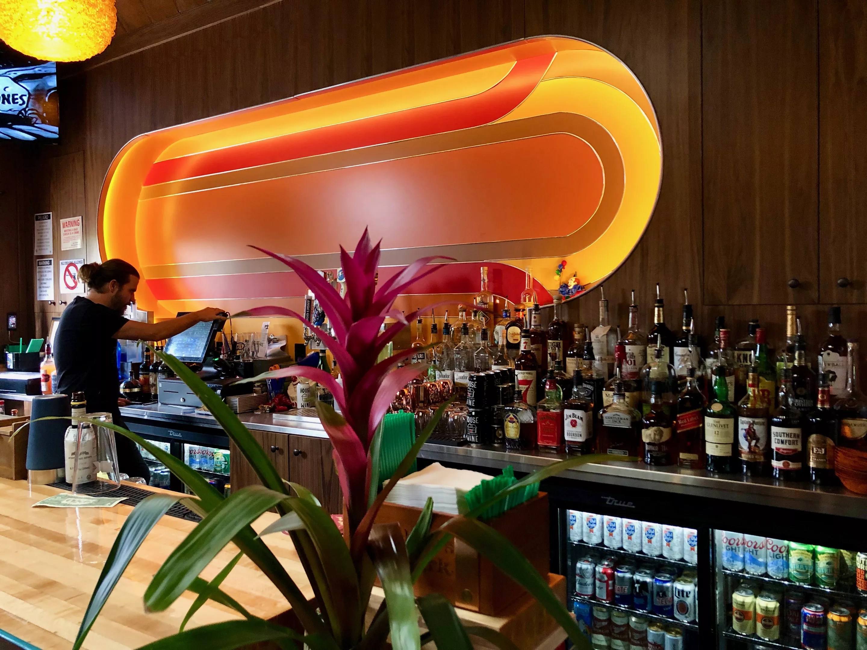 But the most iconic feature of the bar is just that, the bar. Ordering a drink, you face a colorful backdrop behind the register. The yellow, red, and brown display looks like a glowing miniature racetrack. Built by Public House Creative, the piece is made of wood liberated from an abandoned bowling alley in Globe.