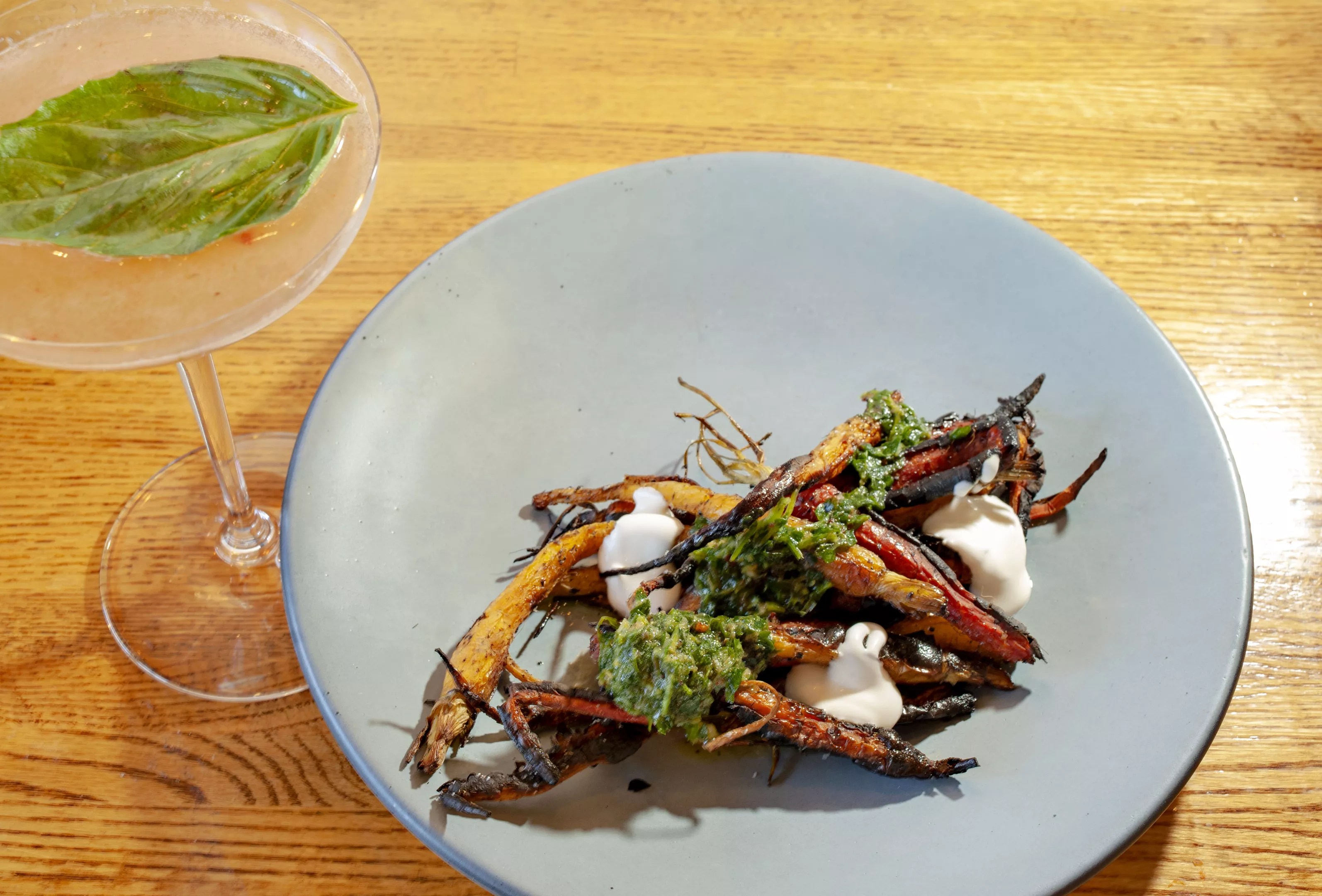 Charred carrots will provoke responses of love or hate. This is a wild, brutalistic dish of spindly carrots cauterized, blackened, subjected to so much heat that they look warped and dipped in ink. The tops are still on; they still have grist from being in the ground; and the char is so armored that salsa verde and mascarpone can’t cut through. But they are enjoyable in a primal way, the kind of dish that reminds you your food comes from a world of life and death and elements.