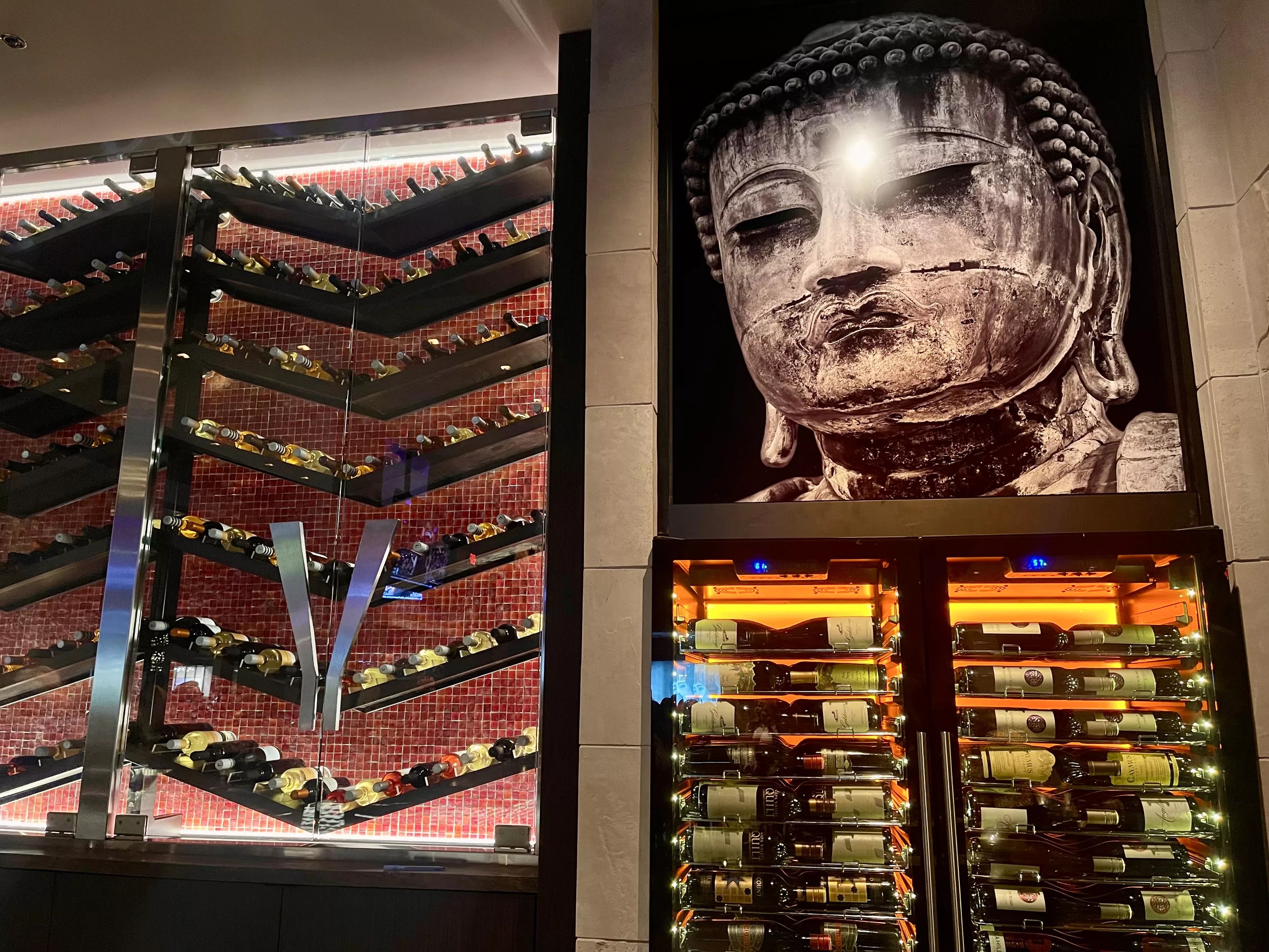 Next to the bar, a wall filled with bottles displays Kasai’s wide range of wine offerings.