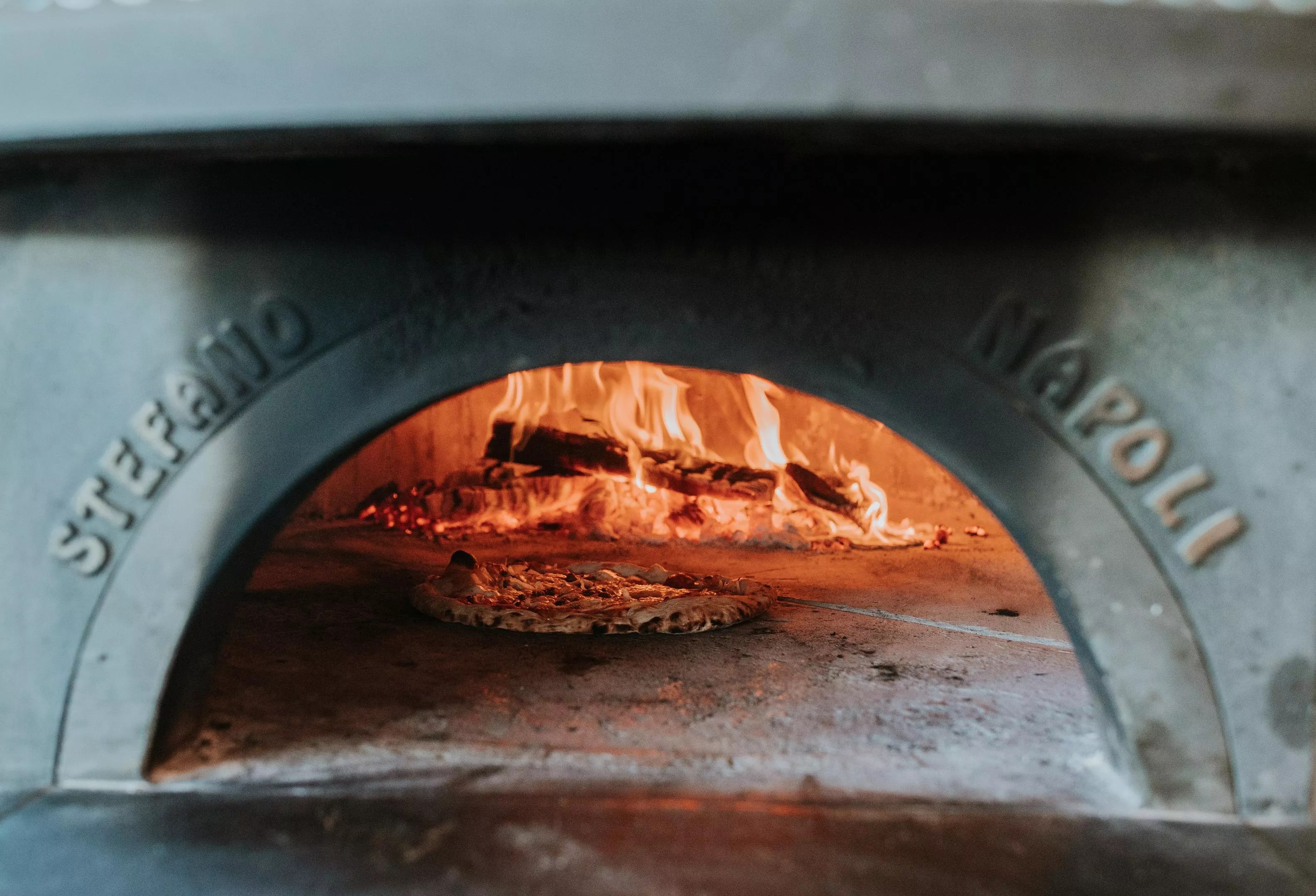 A pie sizzles inside of the restaurant’s custom Stefano Ferrara Forni pizza oven.