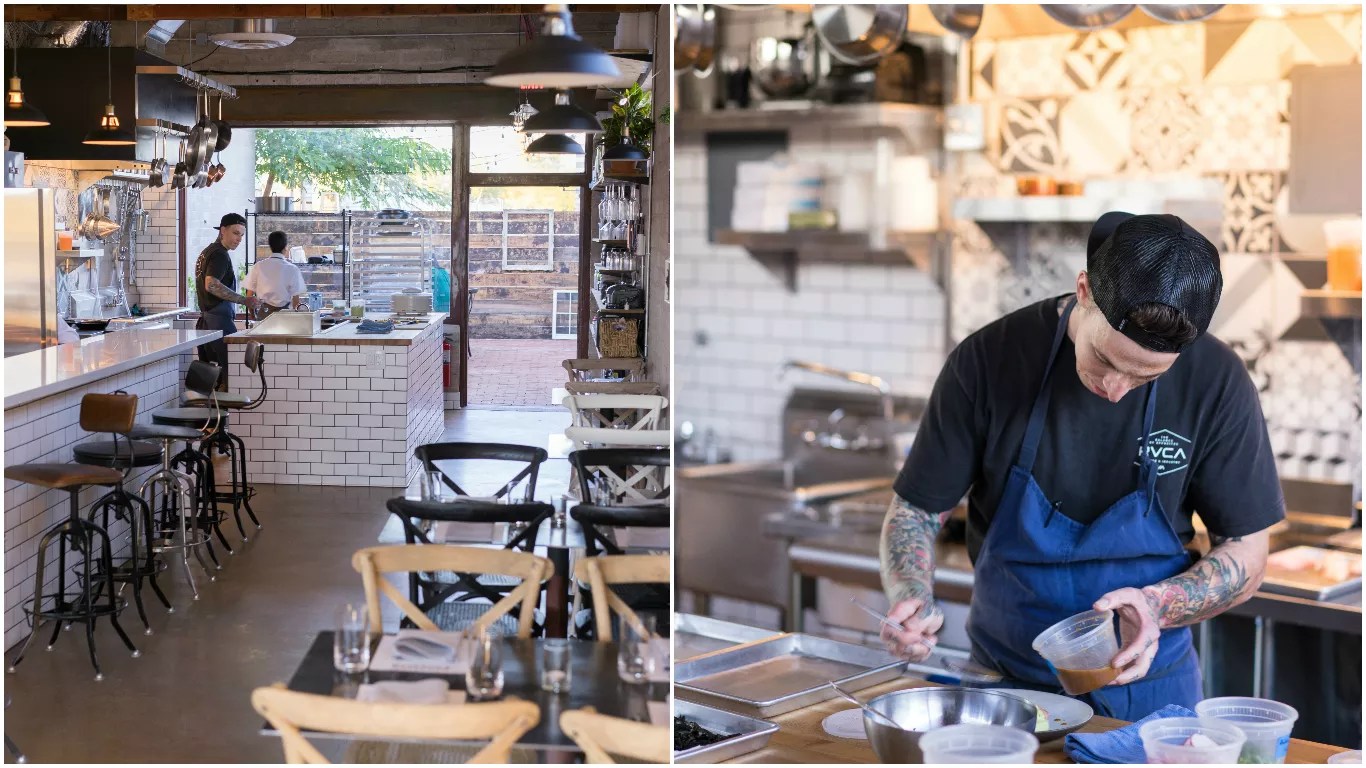 Left: The kitchen and back portion of the dining room of the approximately 37-seat restaurant. Right: Chef Culp plates up a starter dish.