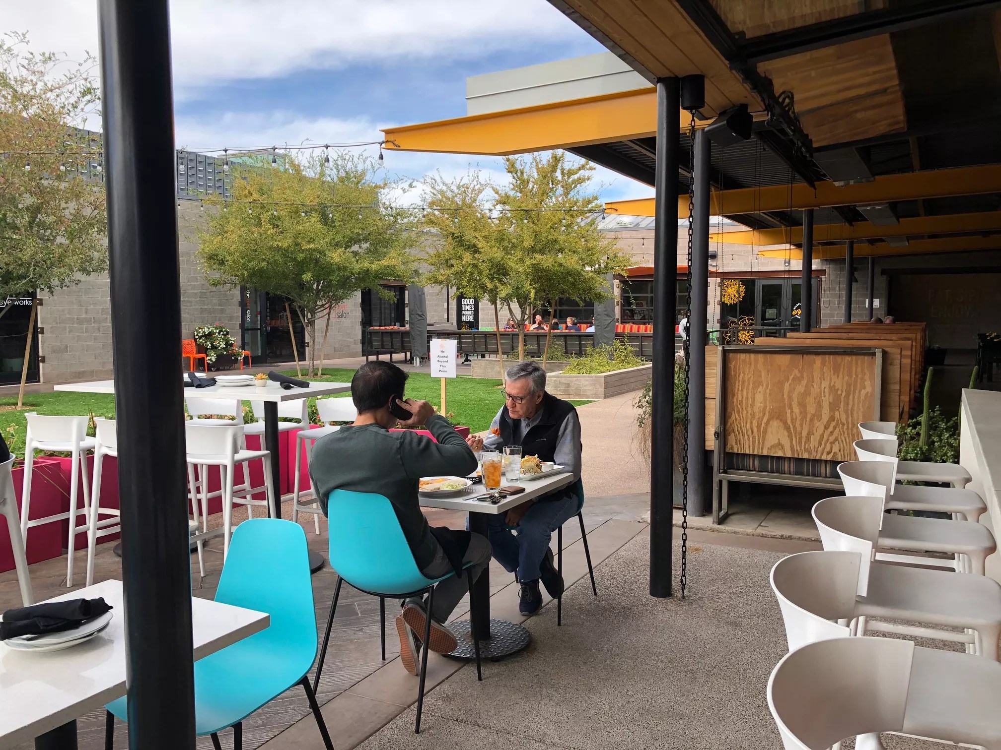 A 45-seat patio opens to a turf green shared with other Crown on 7th properties. Magenta flowers festoon a wall; Oaxacan palomas sweat on tables; the bar smells like citronella (frying oil when the wind shifts); and the caterpillar, thanks to the help of design group Lightvox Studios, has metamorphosed into a wild Sonoran butterfly.