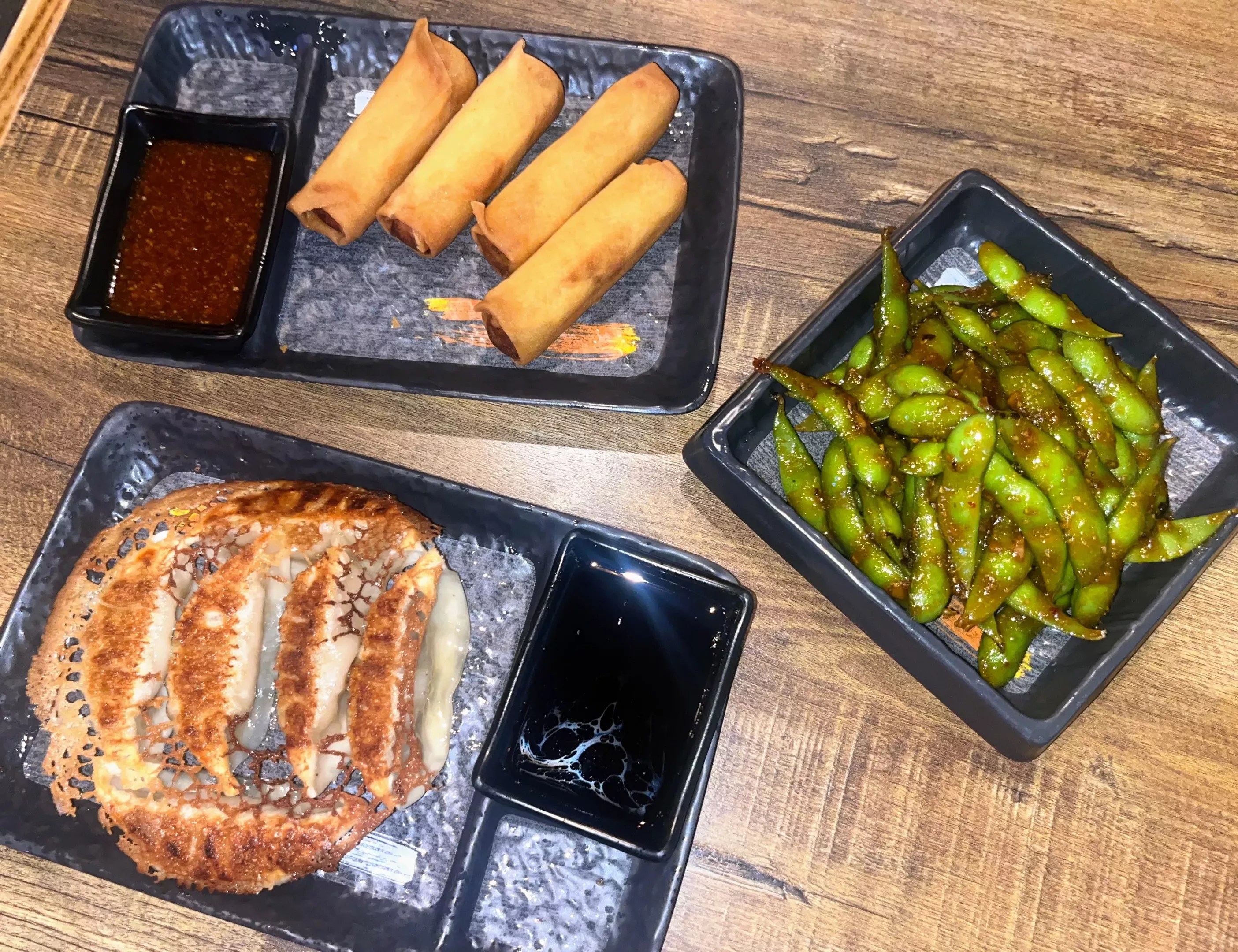 For appetizers, the .99 fried dumplings, crispy on one side and soft on the other, are a popular choice, as are the garlic or plain edamame (right) and the four-piece Spring Rolls (top).
